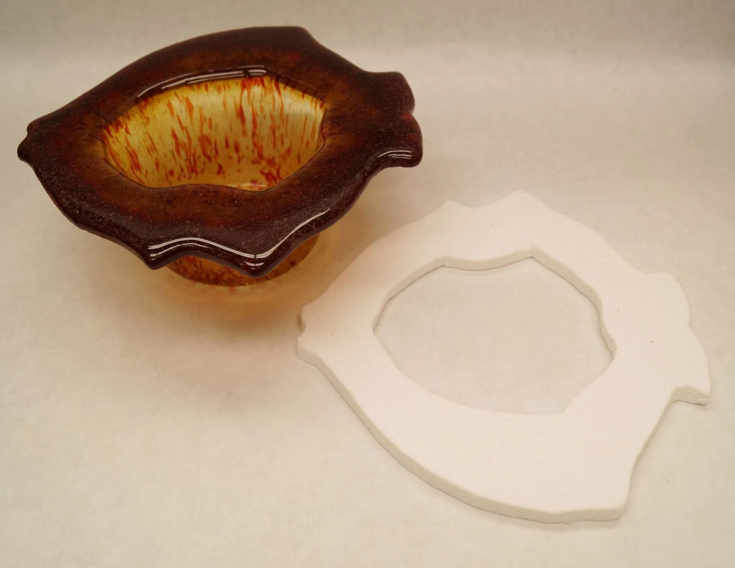 Simply trace your own pattern onto the fiberboard. Cuts easily with a fiberboard saw (as shown in photo). The fiberboard’s pressed ceramic fibers are perfect for creating unique drop molds or walls to cast frit. For single time use, fiberboard can be used as is. For multiple firings, treat first with mold hardener, prefire to cure, and coat with kiln wash. DuraBoard measures 12″ square by 1/2″ thick. Sold individually.