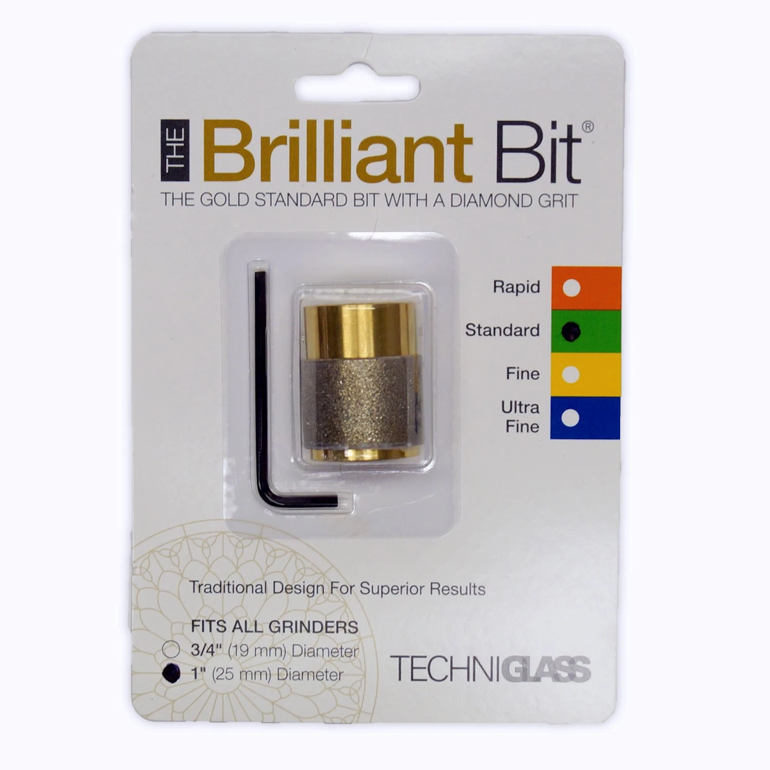Techniglass uses a proprietary diamond bonding technique to layer diamonds to the metal for a more uniform result. The design improves bit performance by reducing the amount of vibrations transmitted through the glass which produce fatigue cracks. One inch diameter bits do not “bite” into the glass quite as much as 3/4″ diameter bits, creating straighter edges and gentler curves. Use standard coarse bits for the majority of your grinding jobs – it’s a perfect medium between having quick grinding and a smooth finish.Â