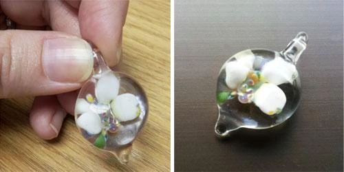 Flower Pendant by artist Chandra Rusk, Hummingbird sculpture by artist Mickey Stanley, ornate pendant by artist Zachary Rice, Jelly fish bead by artist Chip Moore all from Delphi’s Online Artist Gallery.