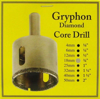Gryphon’s core drill bits for glass artists feature the same high quality coating as their well-respected grinder bits. Diamond bits quickly and easily remove a complete circle in glass. Core bits work with a standard electric drill and only need water as a lubricant. 18mm core bit is equal to approximately 3/4″. Features a 8mm shank.