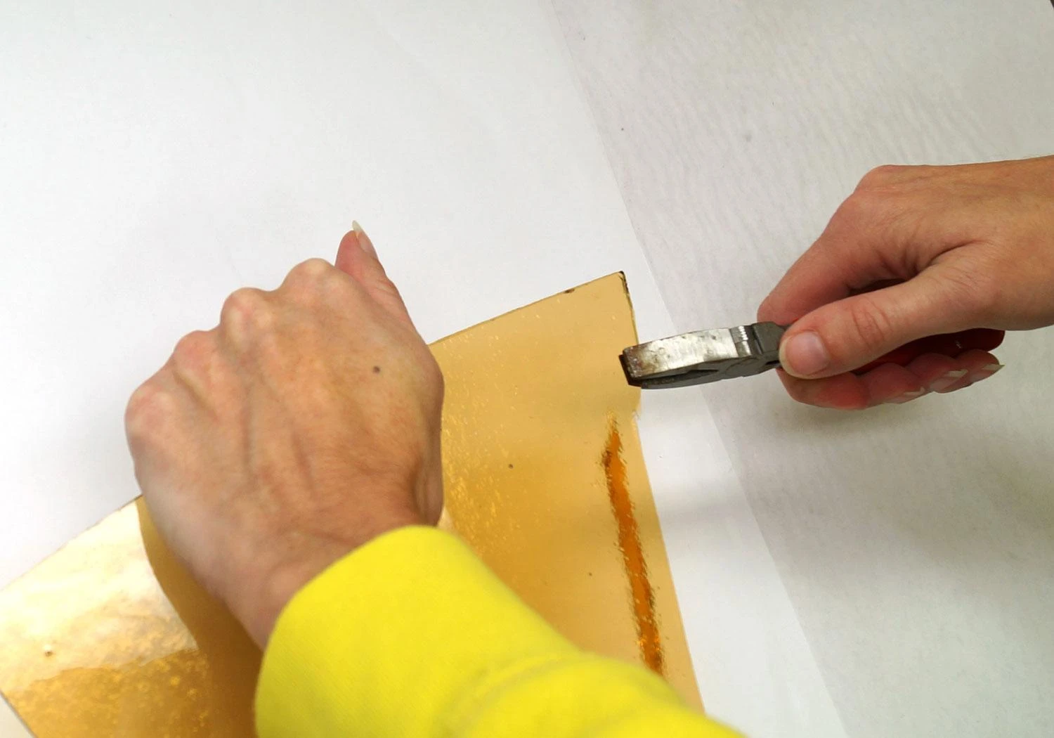 - Position the edge of the plier parallel to the score line, 1/4″ away.