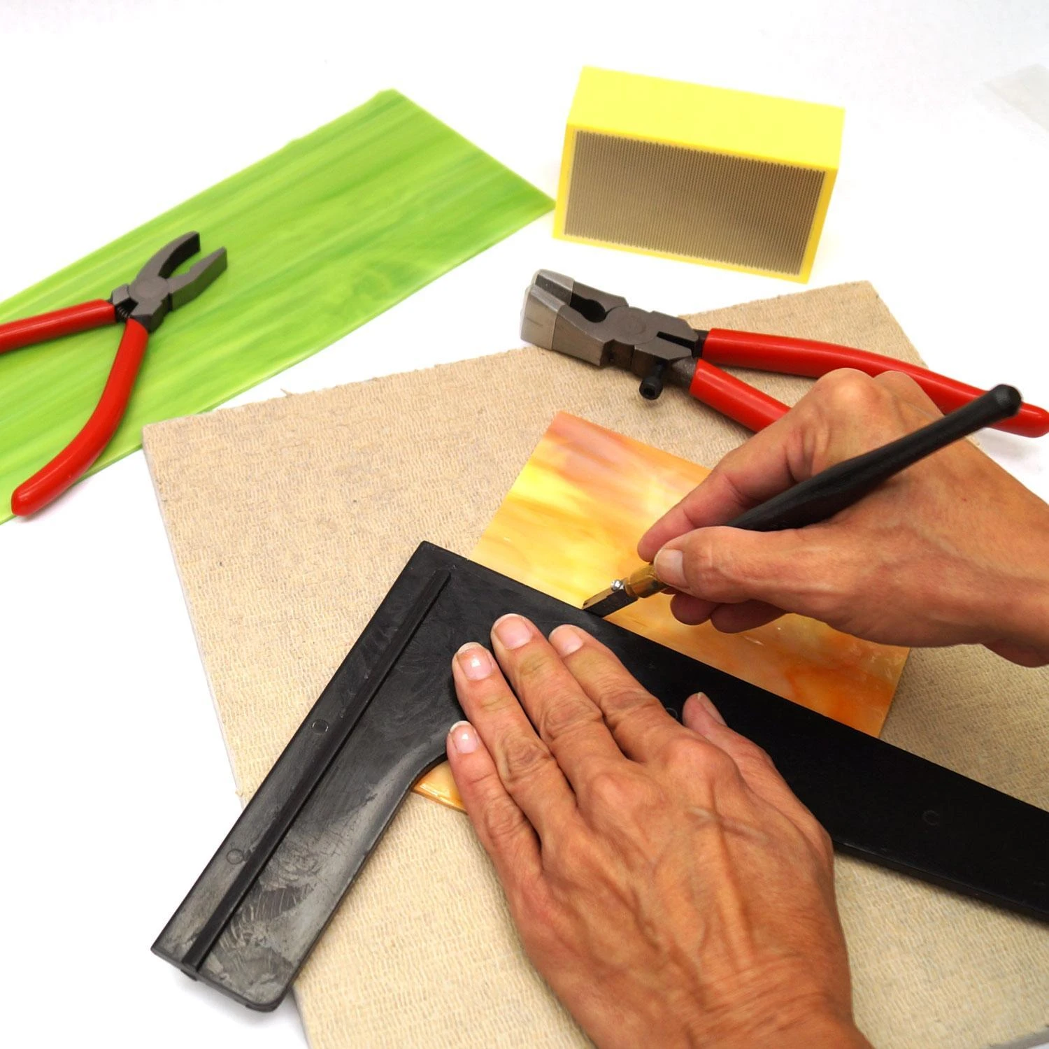 Use pliers to break glass along a score line when the glass can’t be handled comfortably by hand. Wider 3/8” jaws are ideal for breaking long strips. A good score will snap cleanly with this plier. Turn the pliers over to use as a grozer (grozing is the “chewing” action that uses the pliers serrated jaw to nibble glass away from an edge). 6″ long pliers feature spring loaded jaws. Lifetime Manufacturer Guarantee!