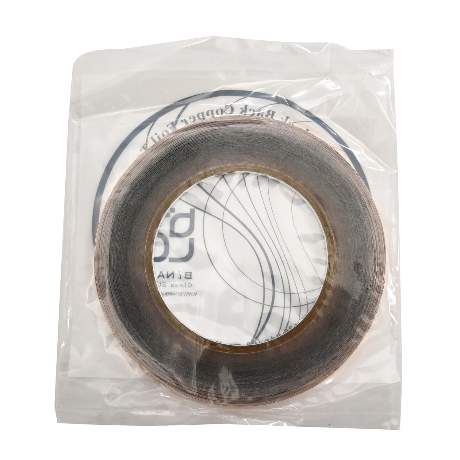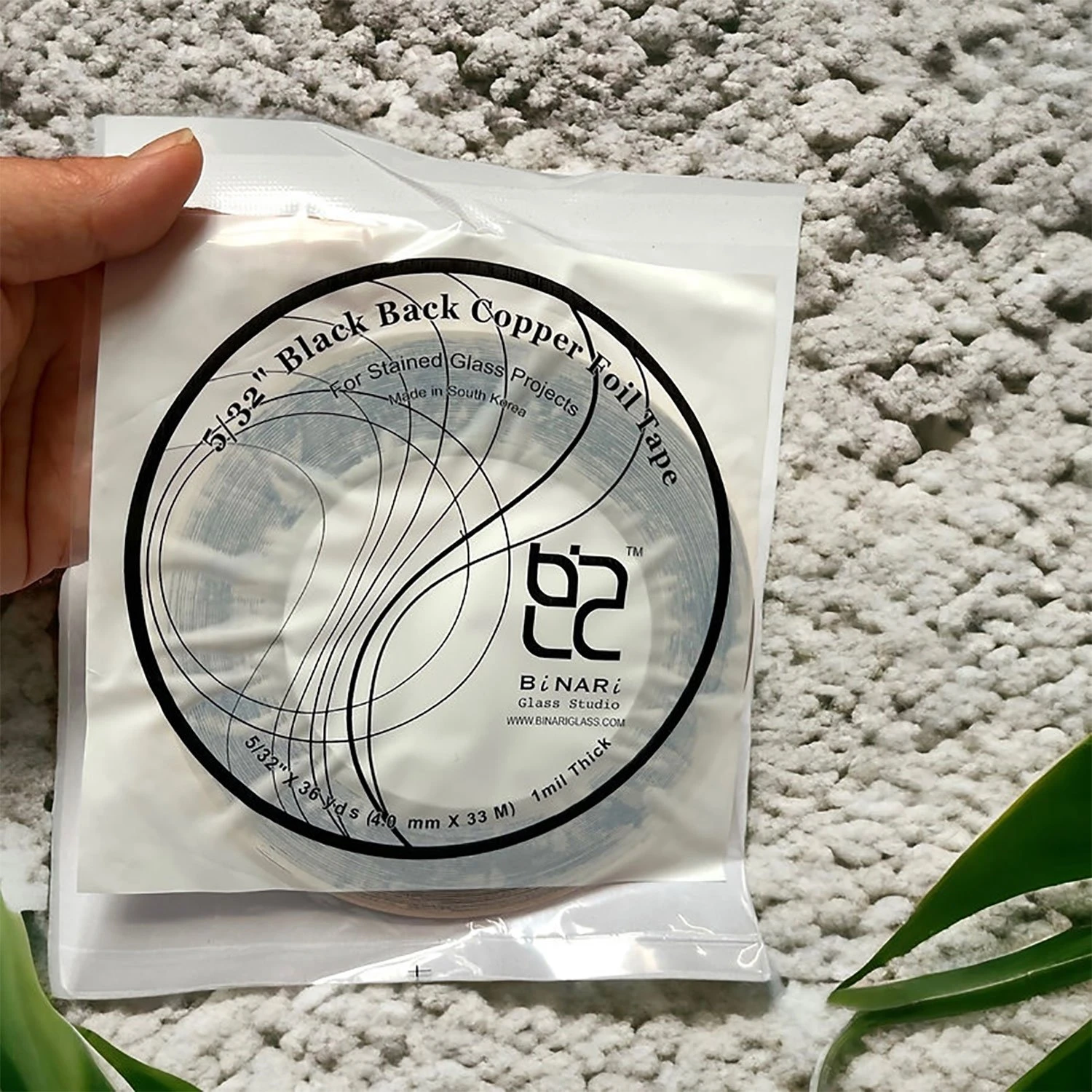 Specially made in South Korea, BiNARi Glass Studio® Copper Foil Tape is new, innovatively lightweight, and artist-friendly. It features durable tack with strong heat-resistant adhesive, making it the excellent choice for producing a smooth, uniform solder bead for stained glass projects. Black backed foil is ideal for projects where black patina will be used to color the finished solder lines. Foil measures 5/32″ wide and 1.0mm thick.