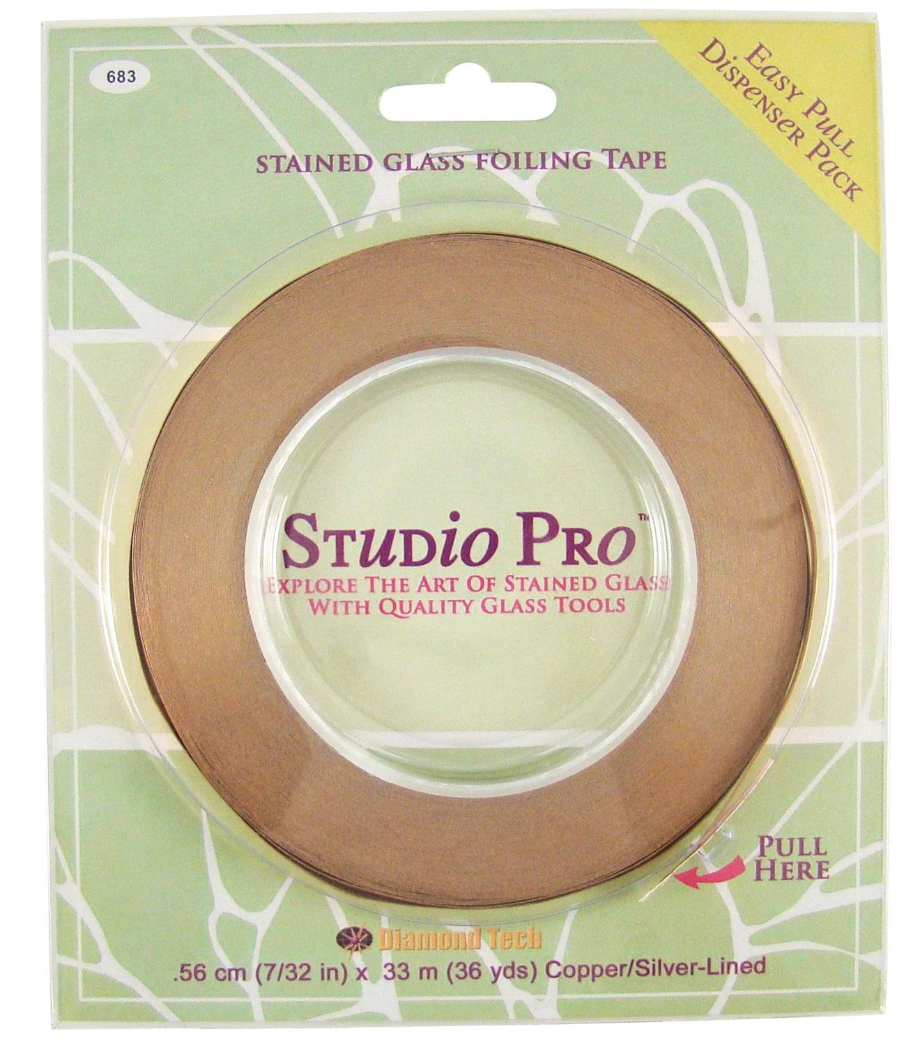 Studio Pro Silver Backed Copper Foil will attach securely to glass edges and corners to provide a smooth, uniform solder bead. Built-in plastic dispenser keeps rolls orderly. Standard 7/32″ width and 1.0 millimeter thickness. 108 foot rolls.
