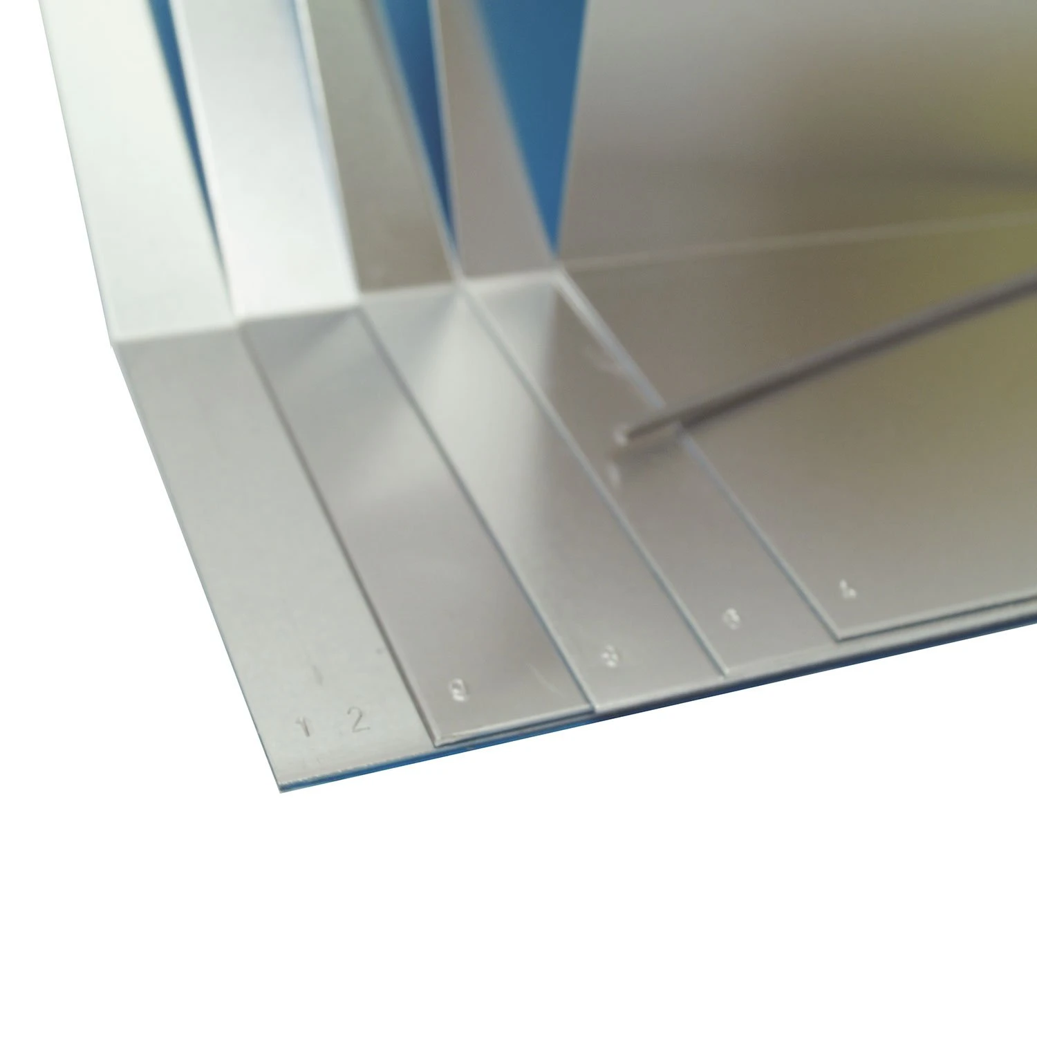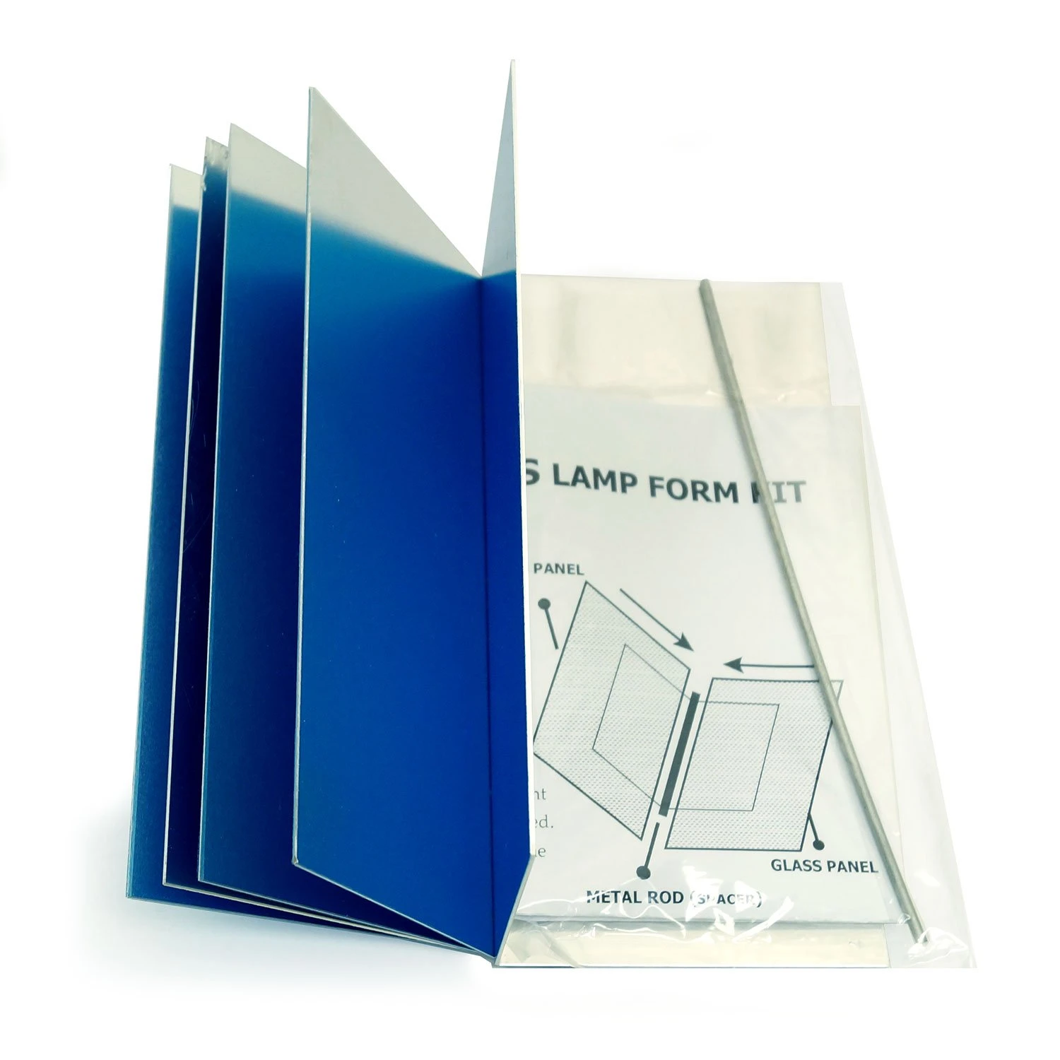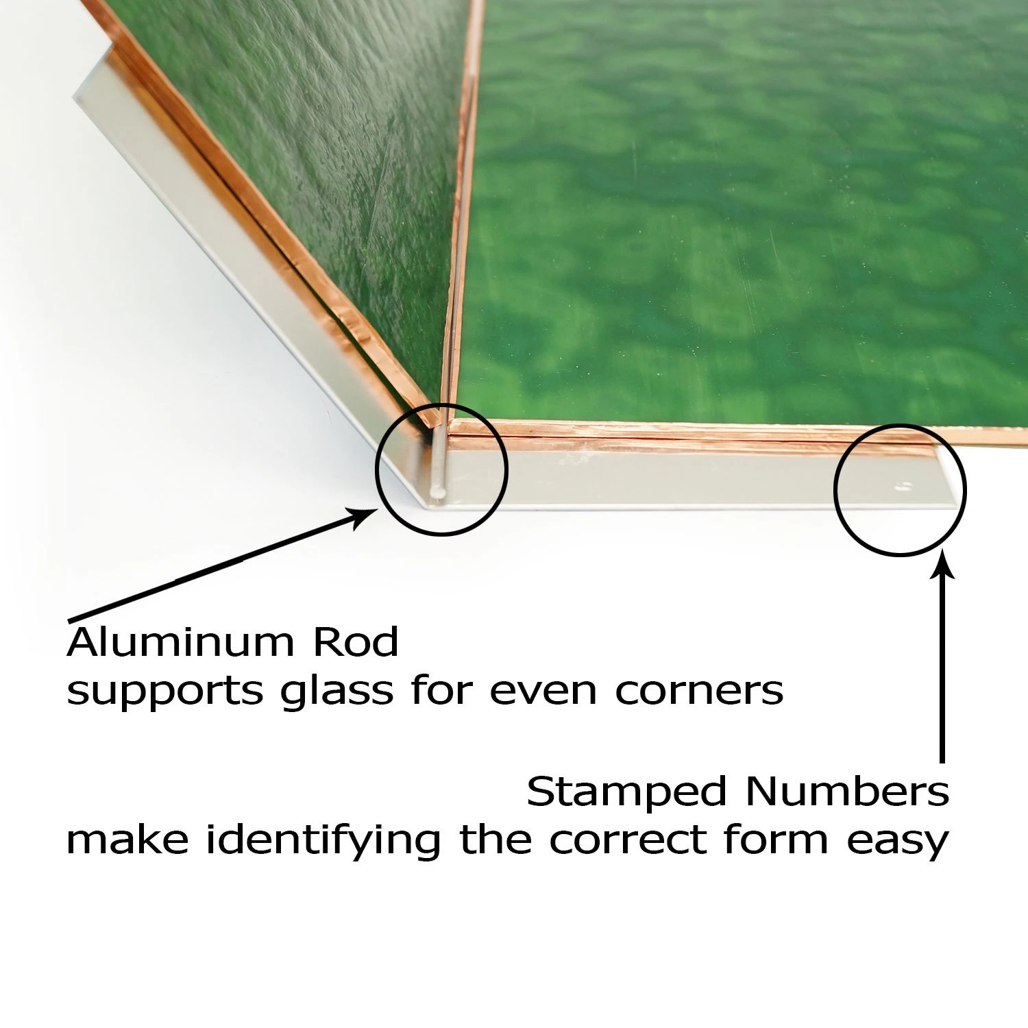 Get perfectly aligned joints for all your 3-D projects. This helpful tool supports glass pieces when soldering boxes, panel lamps and 3-D art. Set of five, 8″ long x 4″ high aluminum forms each create a different angle; 90°, 120°, 135°, 140° and 150°. A round metal rod is included as a spacer, allowing you to create strong, even solder beads. Each form is stamped to indicate the angle, labeled as indicated in the list below.