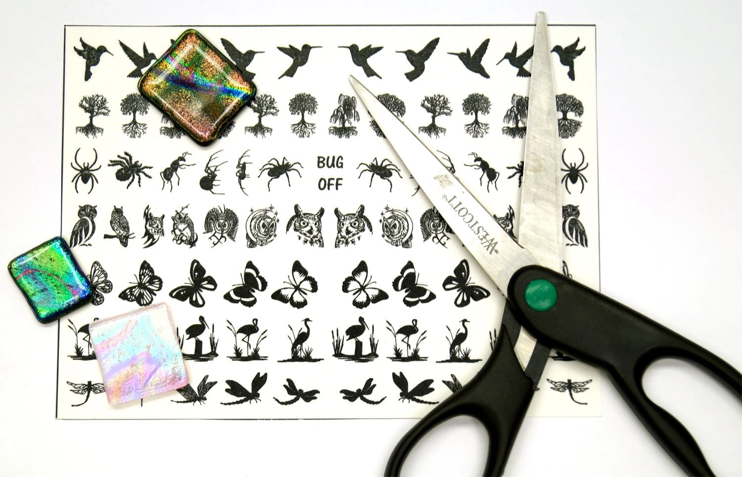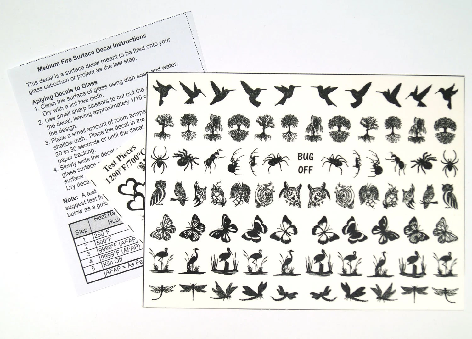 Detailed silhouettes are perfect for jewelry and other fused art with personality. Fusible enamel decals stay black when fired in the kiln. Sheet measures 5″ x 7″ and includes 78 decals. Designs measure approximately 5/8″. Works with all glass COEs.