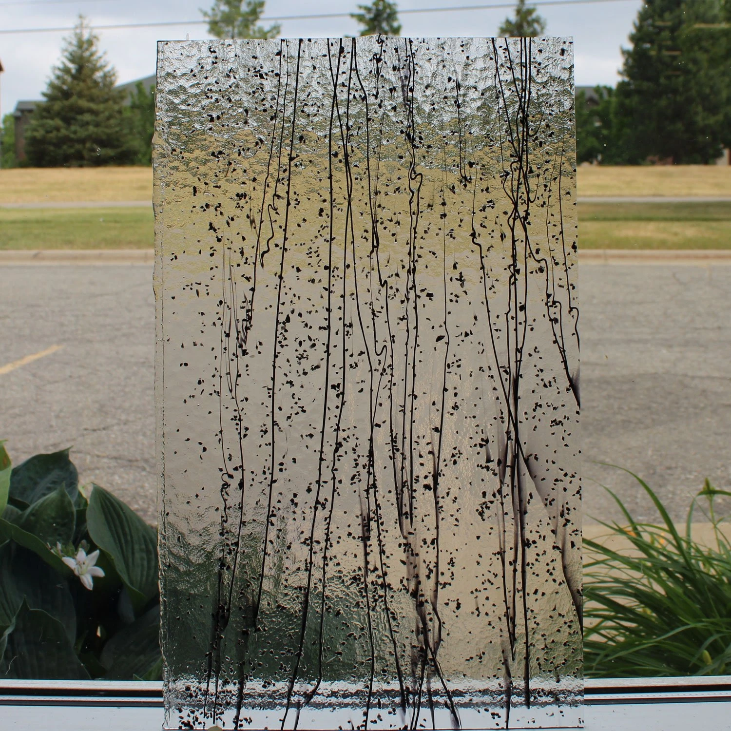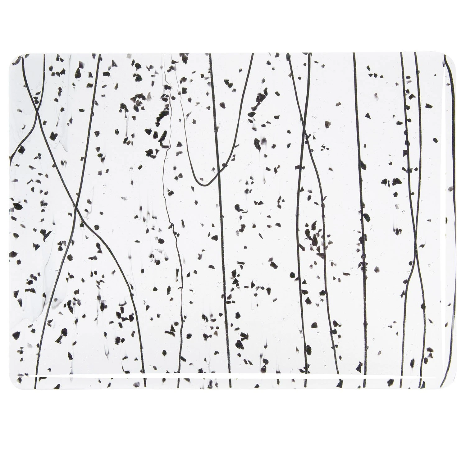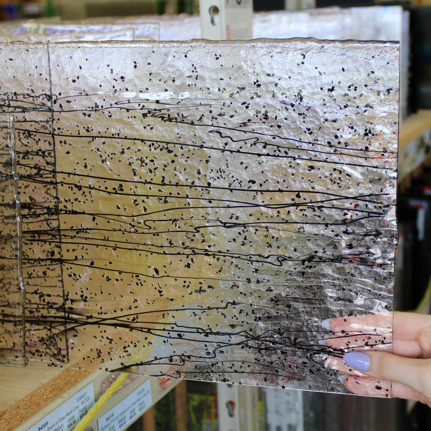 Mardi Gras sheets combine a colorful sprinkling of frits with glass threads of stringers – that fuse, twist and curve under the force of the clear molten glass into a lively cascade reminiscent of Carnival or ticker tape parades. Great for backgrounds or accents! Features a mix of black on clear base glass. Single-rolled “Catspaw” transparent fusibles have slightly knobby textured backs and pointillistic light transmission. Standard thickness 3mm. 90 COE.