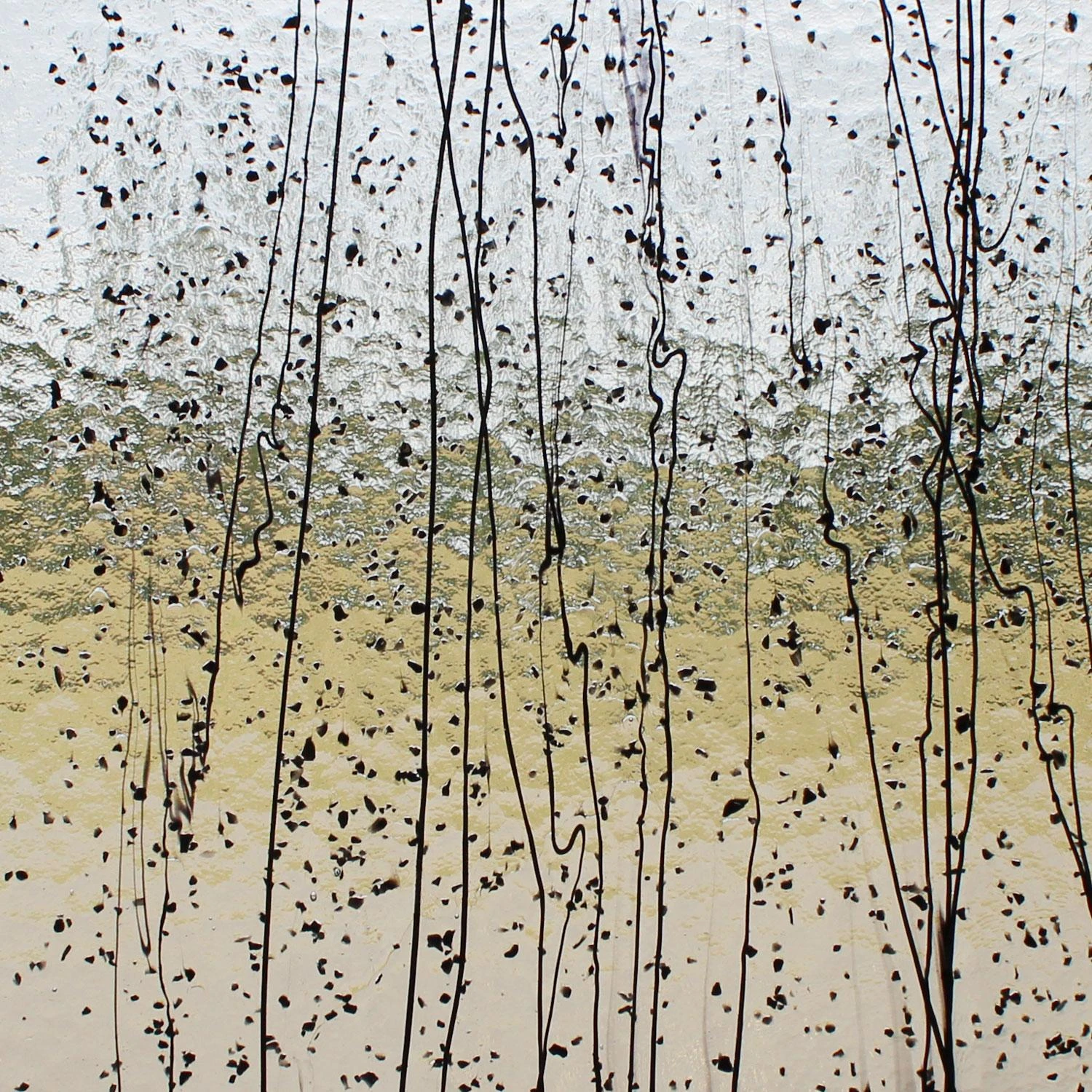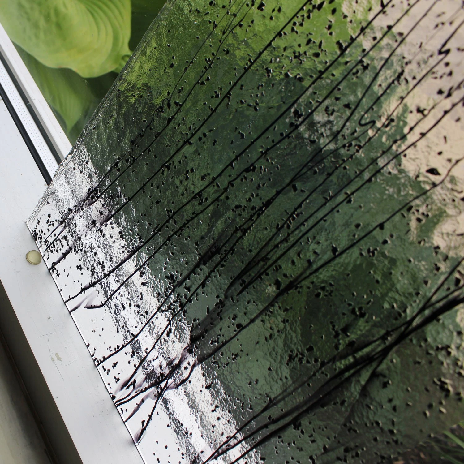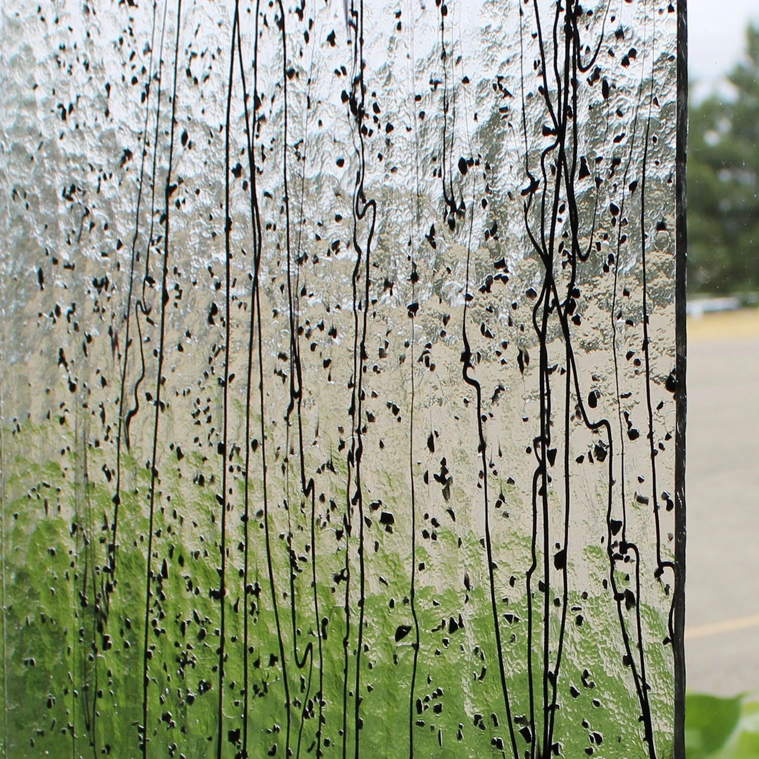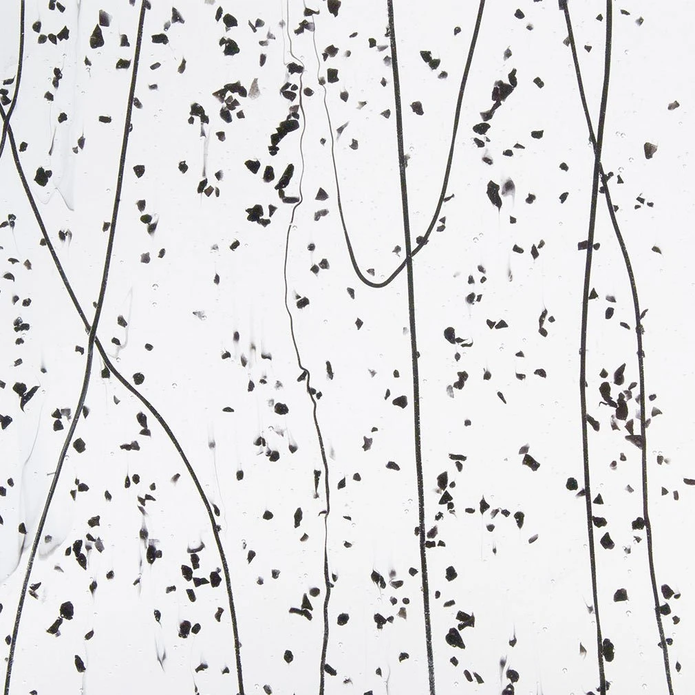 Mardi Gras sheets combine a colorful sprinkling of frits with glass threads of stringers – that fuse, twist and curve under the force of the clear molten glass into a lively cascade reminiscent of Carnival or ticker tape parades. Great for backgrounds or accents! Features a mix of black on clear base glass. Single-rolled “Catspaw” transparent fusibles have slightly knobby textured backs and pointillistic light transmission. Standard thickness 3mm. 90 COE.