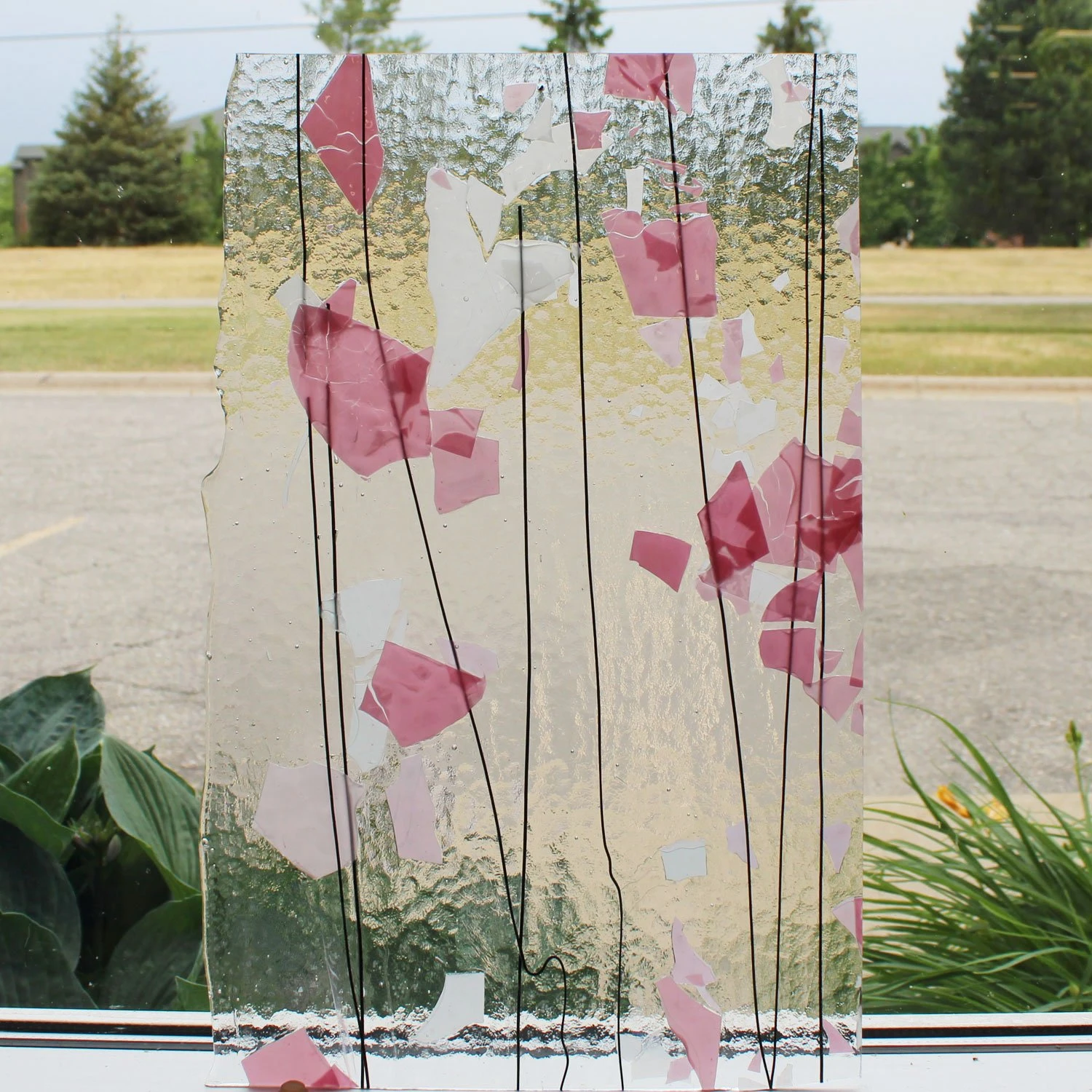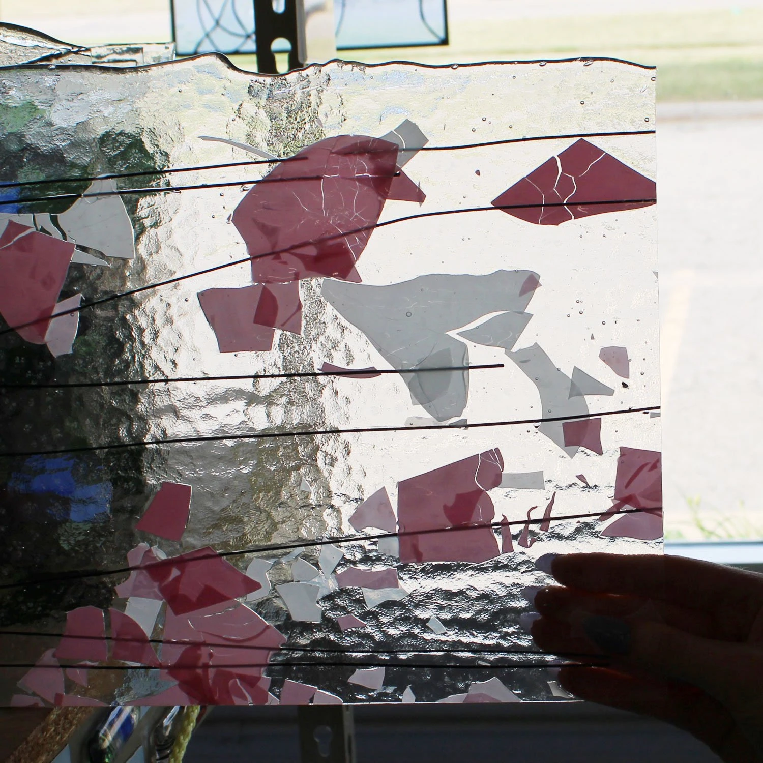 Fracture streamer glass consists of paper-thin shards of colored glass and float in curving black glass threads on a clear background. Excellent for background and accent pieces. Features a pastel color combination. Single-rolled “Catspaw” transparent fusibles have slightly knobby textured backs and pointillistic light transmission. Standard thickness 3mm. 90 COE.