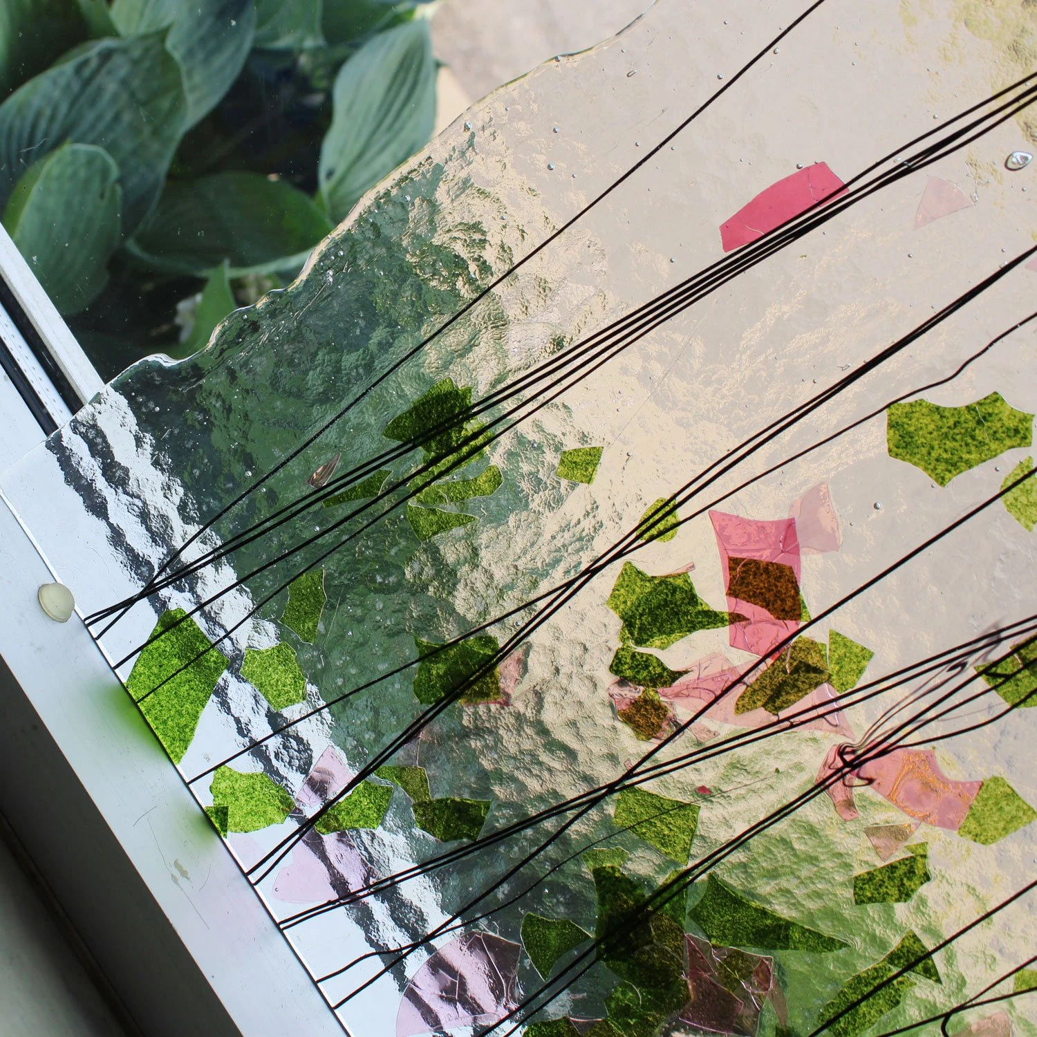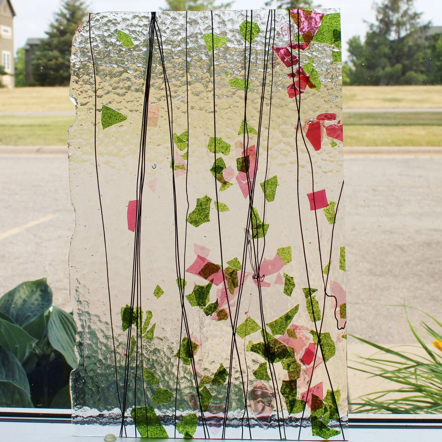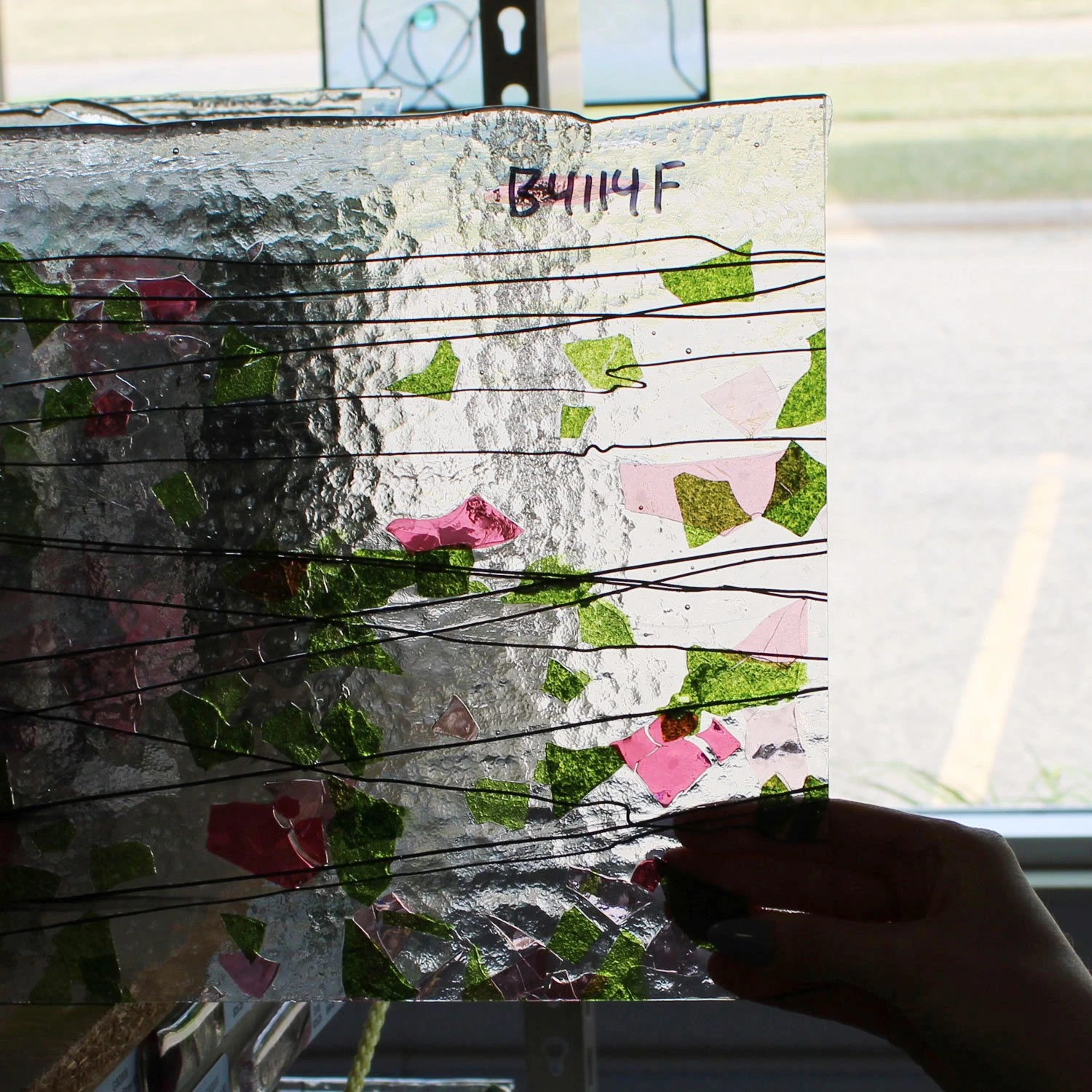 Fracture streamer glass consists of paper-thin shards of colored glass and float in curving glass threads on a clear background. Excellent for background and accent pieces. Features a pretty rose garden color combination. Single-rolled “Catspaw” transparent fusibles have slightly knobby textured backs and pointillistic light transmission. Standard thickness 3mm. 90 COE.