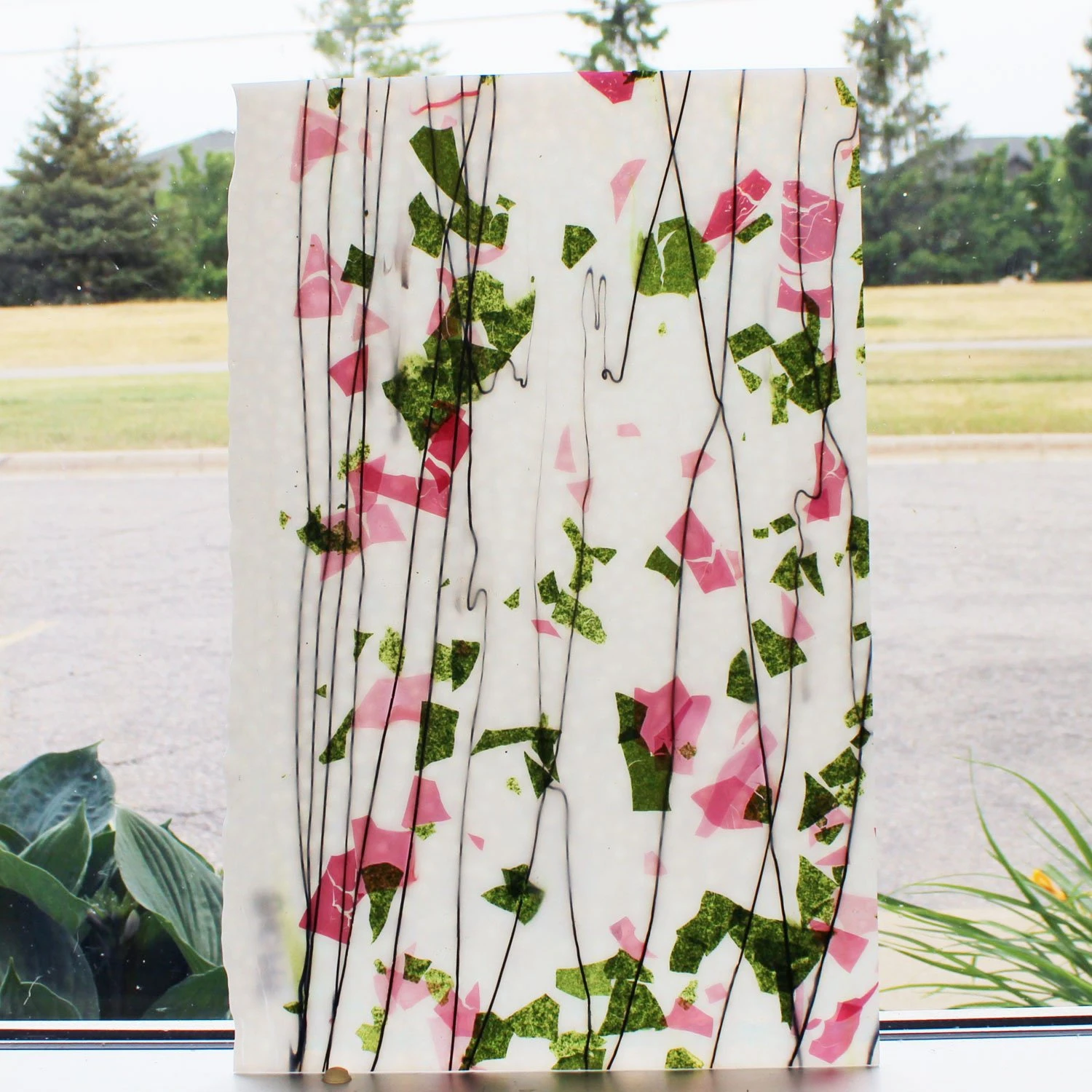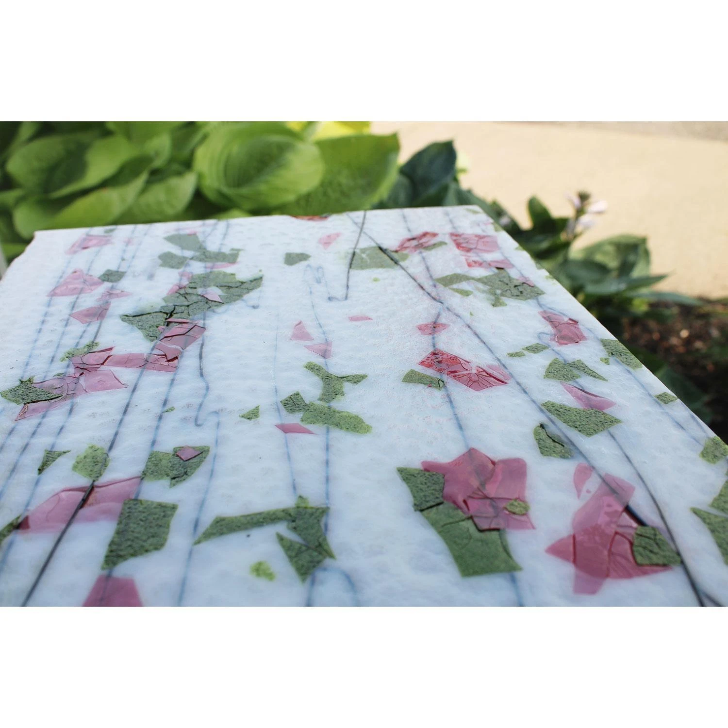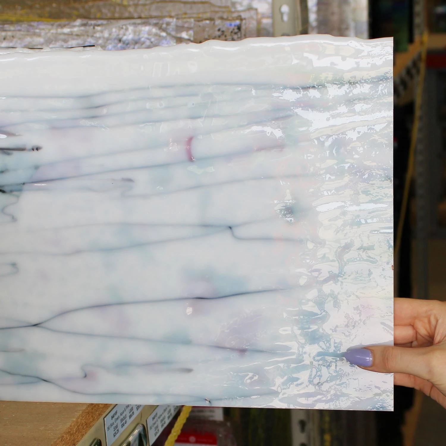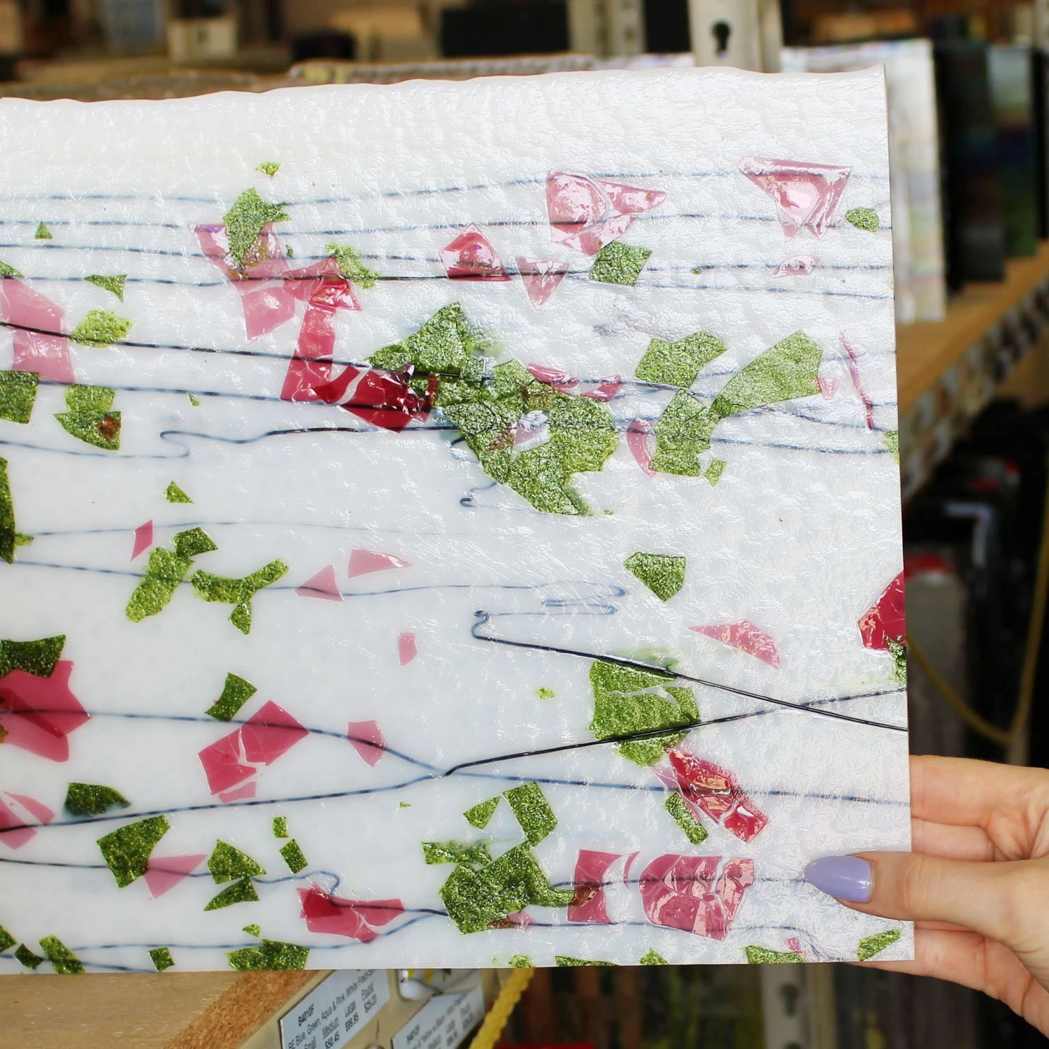 Fracture streamer glass consists of paper-thin shards of colored glass and float in curving glass threads on a white background. Excellent for background and accent pieces. Features a pretty rose garden color combination. Single-rolled “Catspaw” transparent fusibles have slightly knobby textured backs and pointillistic light transmission. Standard thickness 3mm. 90 COE.