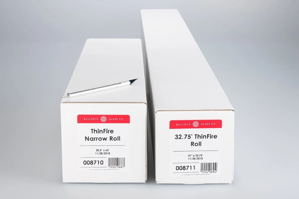 Popular Bullseye ThinFire Shelf Paper doesn’t shrink in the kiln and features a printed pattern of the Bullseye logo on the bottom side, as shown in additional images. The logo pattern does not affect glass or kiln shelves. Nor does it change the way ThinFire works in any way. But it does provide two benefits: One, the pattern makes it easy to recall how ThinFire should be positioned in the kiln. Just remember, logo side down against the shelf; plain side up, against the glass—to create the smoothest, cleanest-possible finish for your work. Two, the pattern serves as an assurance that Bullseye ThinFire is tested, tried and true.