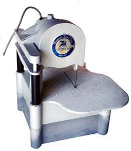 The C-40 Band Saw is very fast, quiet and reliable. It removes a thin line of material as it cuts, and is best suited for lapidary work and for cutting thick slabs of glass. It is designed for cutting intricate patterns in hard material, and is used often in industry for cutting exotic materials.