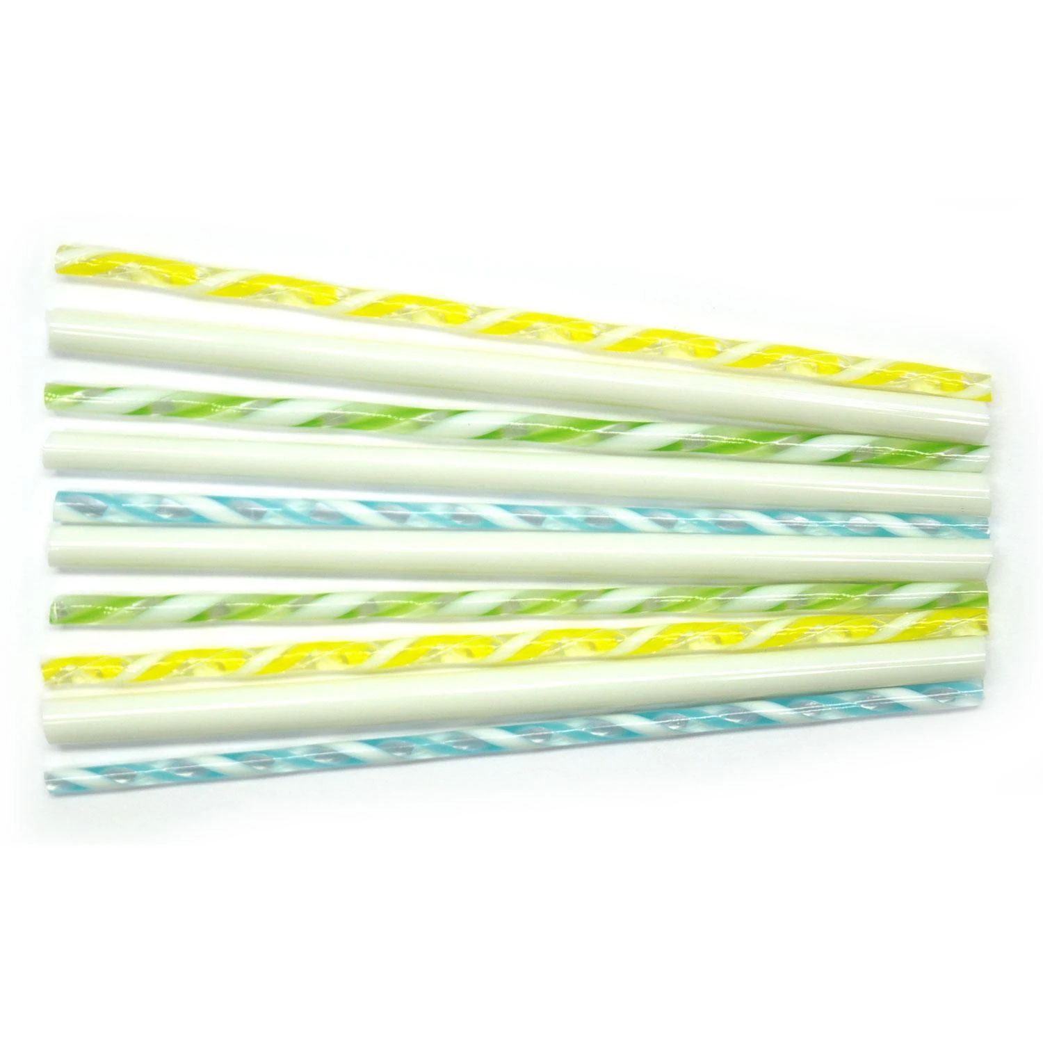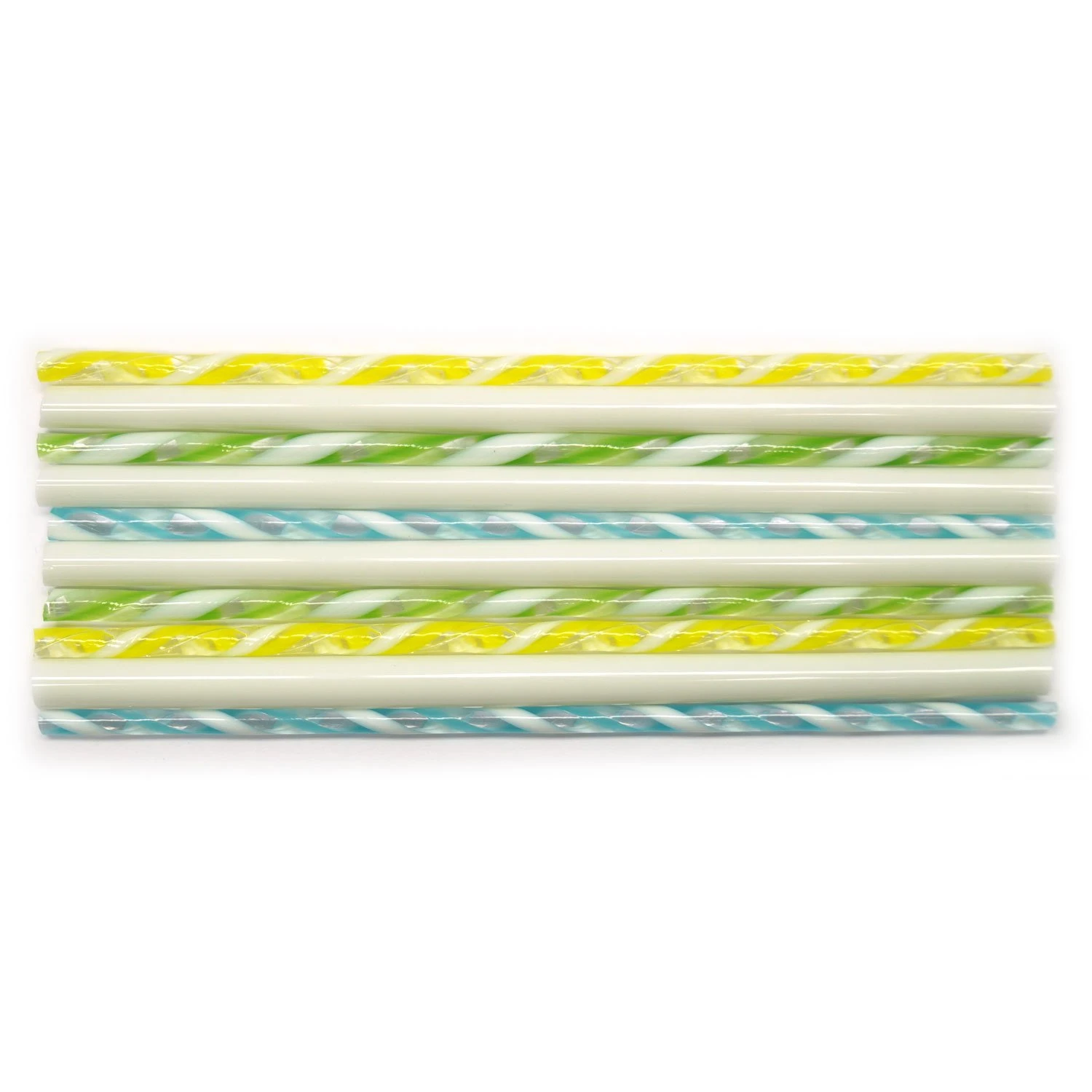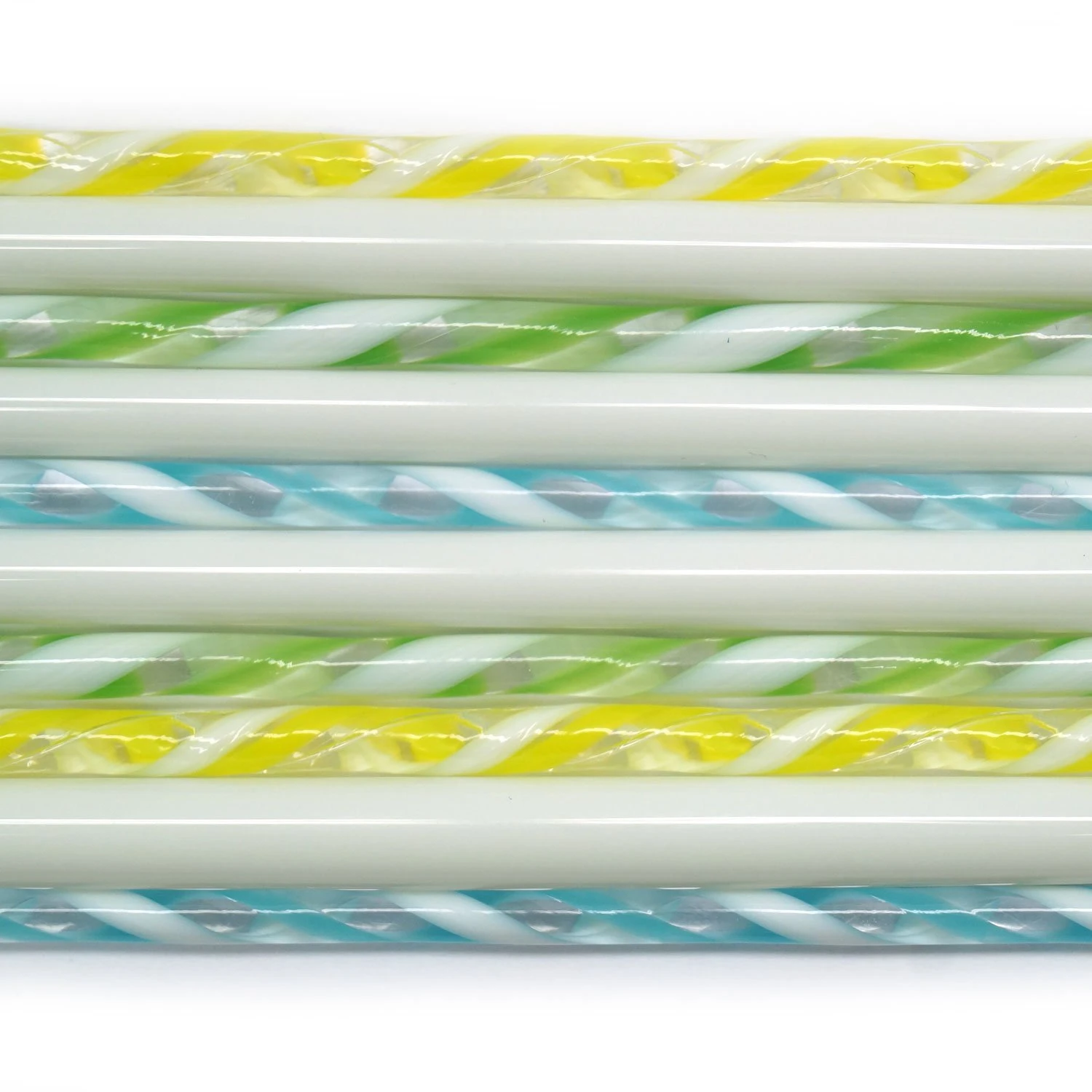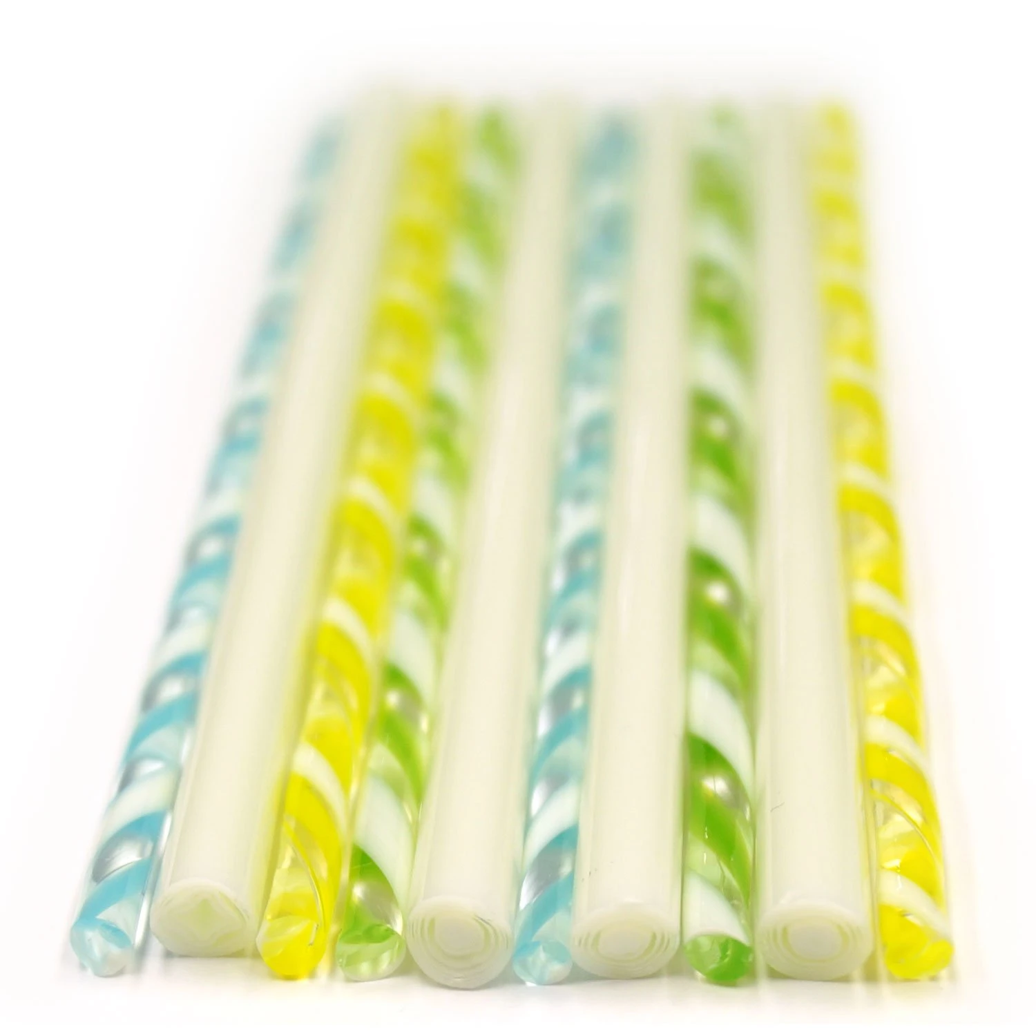 Neutral white rods are filled with a fun millefiori design and are coordinated with cool colored twisted cane, all made from premium glass. Use to create borders and accents in fused projects. Rods and cane are approximately 4mm to 7mm diameter x 5″ long. 10 pieces. 90 COE.