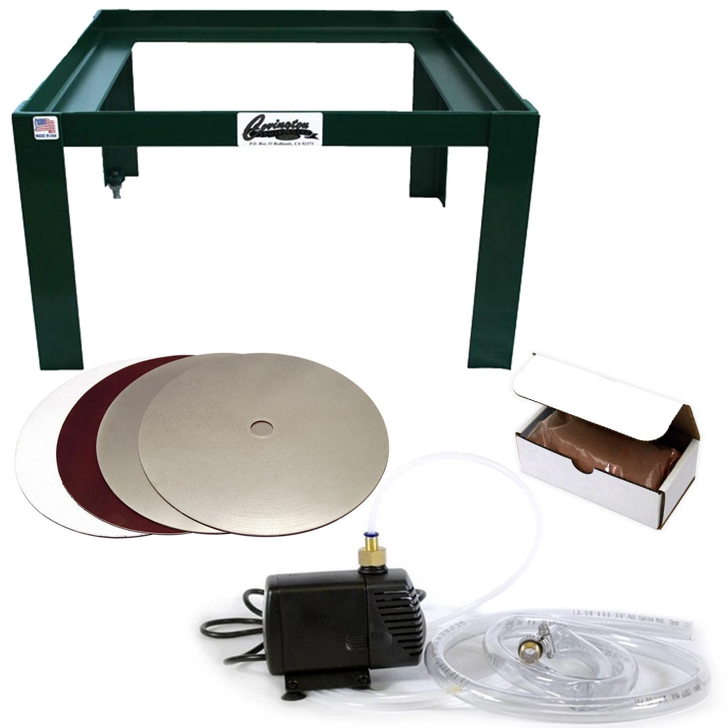 - Includes submersible pump, stand, grinding and polishing discs, cerium oxide and tubing