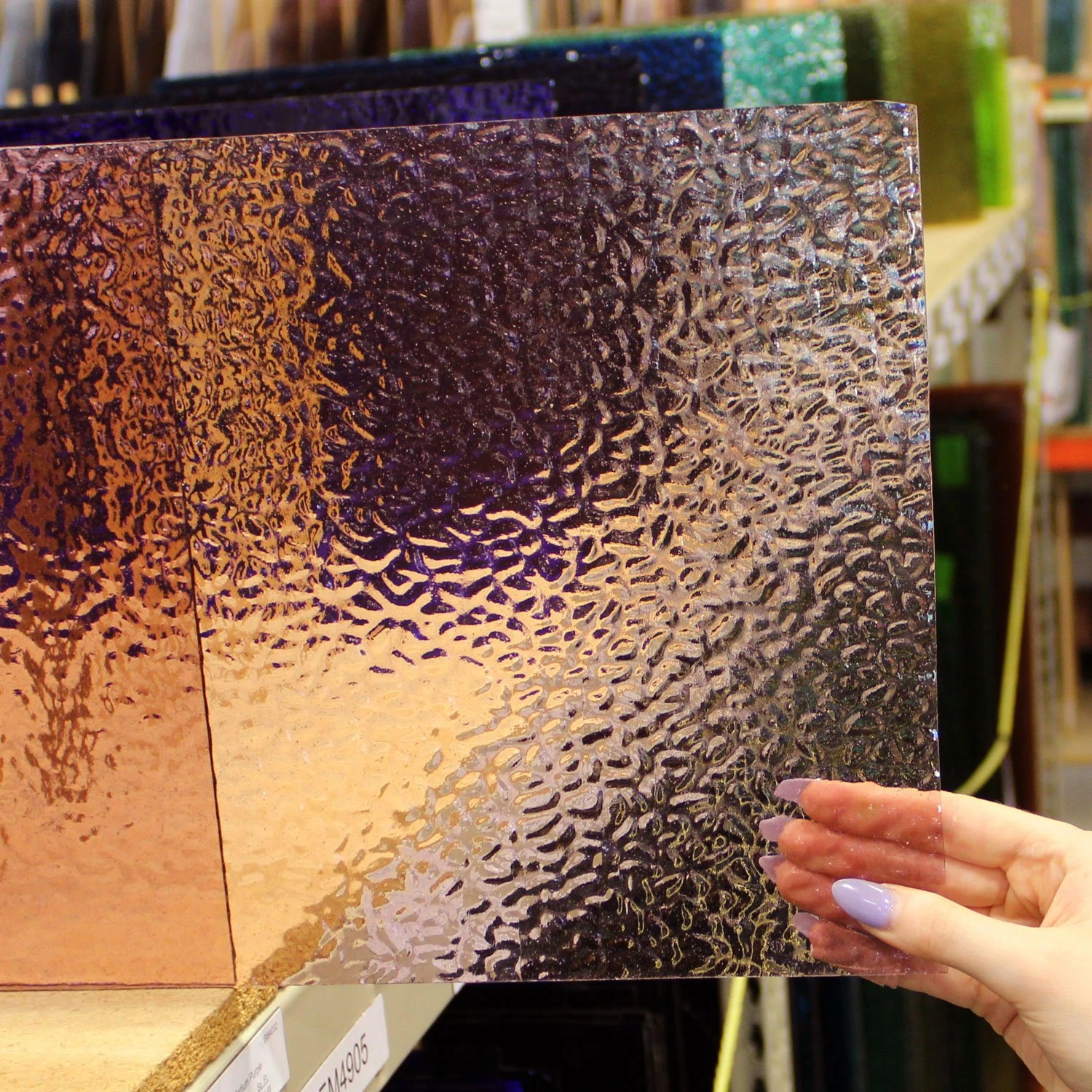 Originally popular in Victorian windows, English Muffle glass is now being reintroduced in both restoration and new work. This glass is known for its traditional muted colors, highly refractive texture and crystalline quality. The multi-directional texture allows minimum waste. Glass pieces may include factory rolled edges.