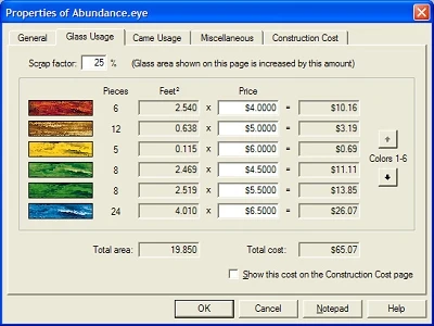 - Includes a calculator that shows materials usage, and a handy cost estimator that takes the guesswork out of pricing your design. For an example see the computer screen image below.