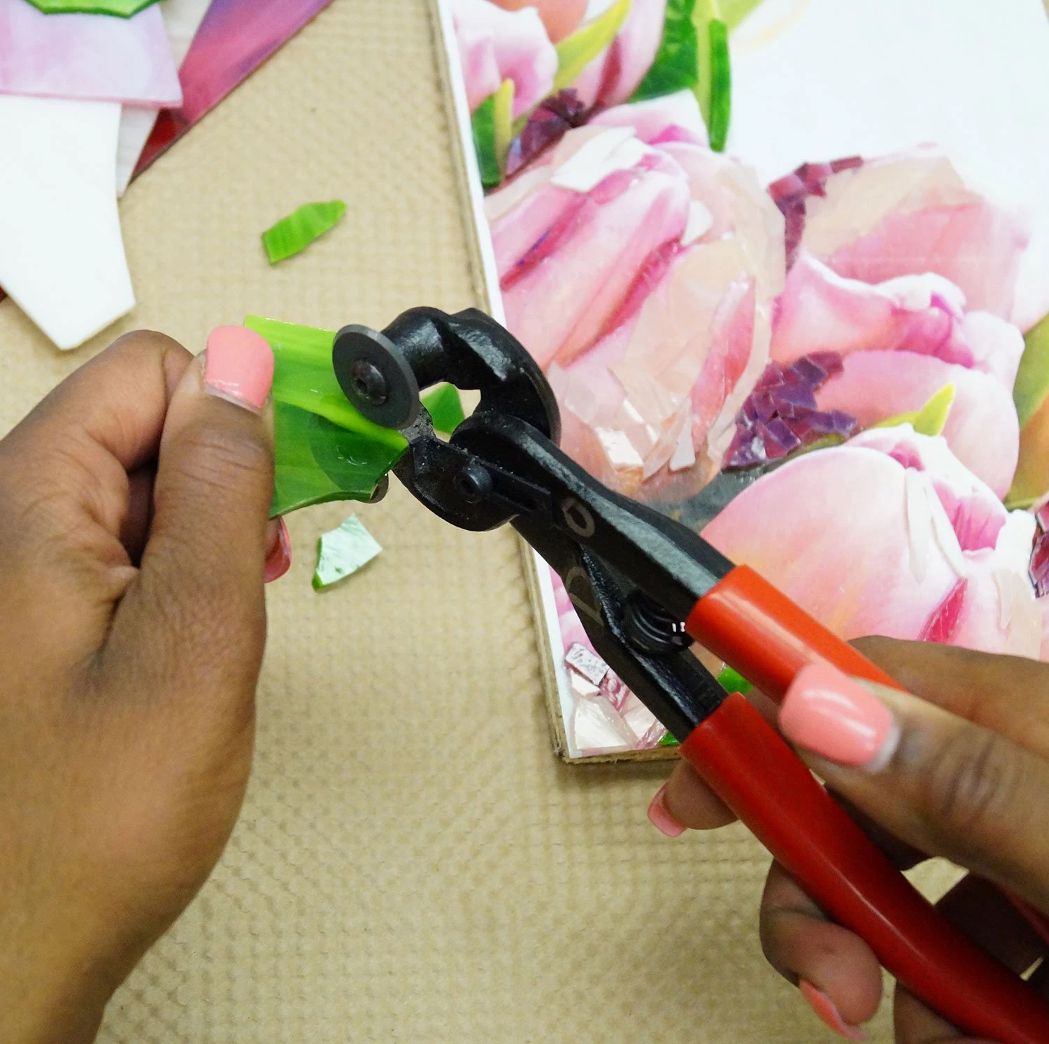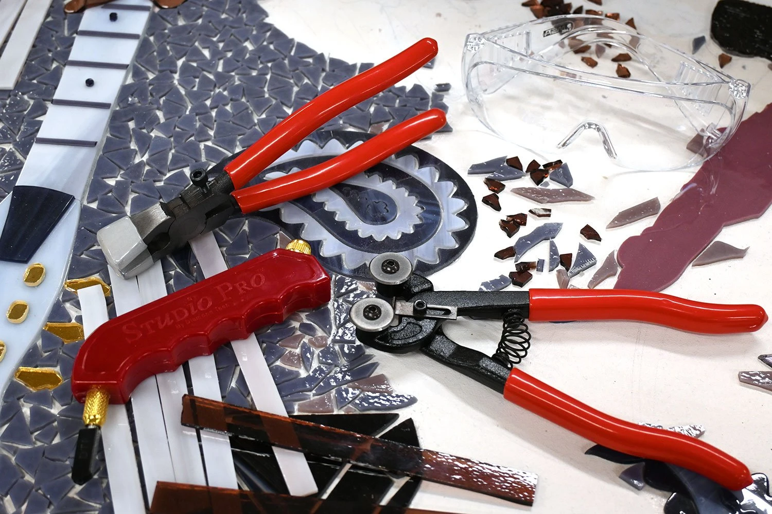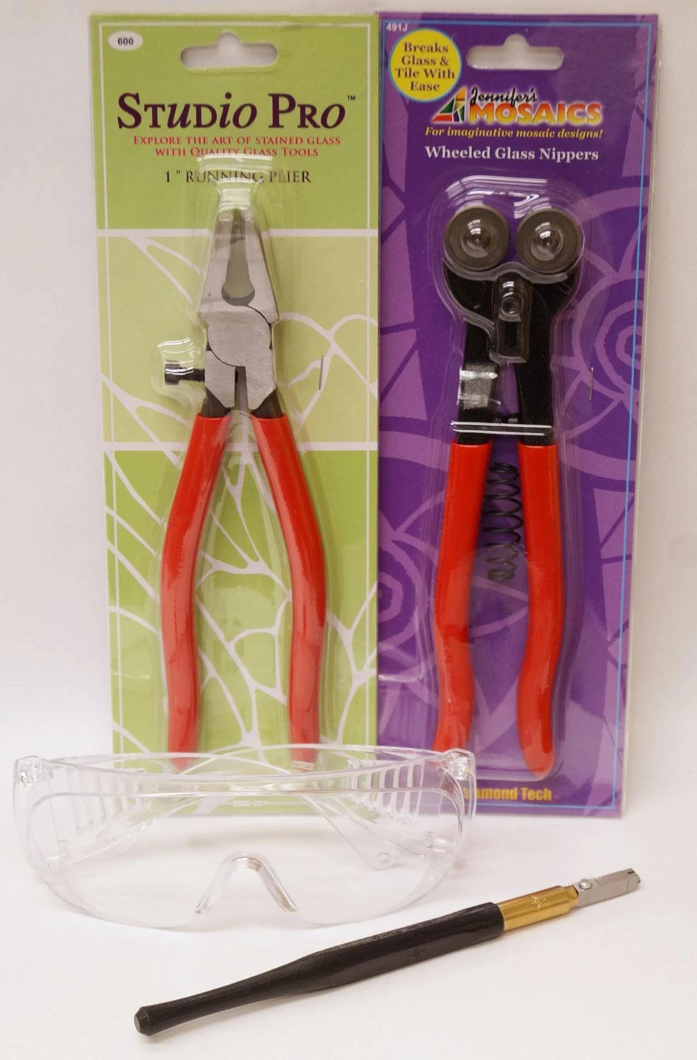 Works well for stained glass, mirror, and glass tiles. Use the glass cutter and running pliers to cut out shapes. The nippers are an excellent time-save tool for nipping small pieces to fill in backgrounds. Kit includes safety glasses, wheeled nippers, running pliers and pistol grip glass cutter.
