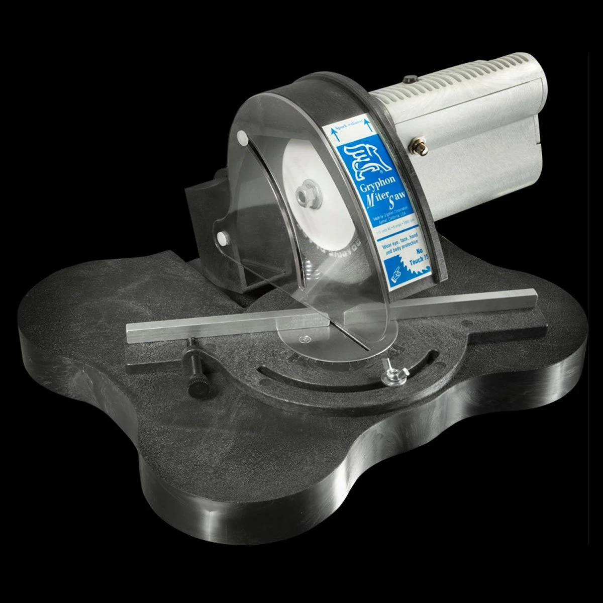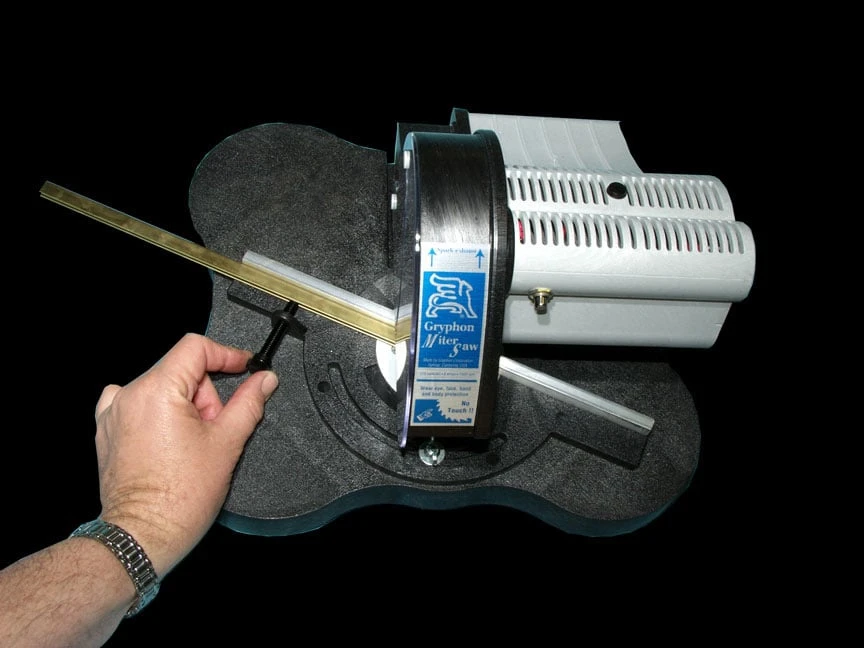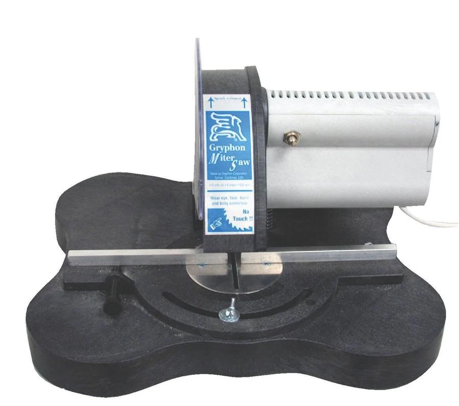 The Gryphon Miter saw is particularly well suited for making repeat, precise miter cuts in thin wall extrusions of brass, zinc, steel and copper. Make accurate repeat cuts up to 45° in either direction on the saws large 13″ x 15″ adjustable table with protractor scale. A Thumbscrew clamp holds work securely to the fence while cutting and a built-in blade shield keeps fingers safe. The ultra-thin abrasive blade coupled with the 1.1 hp motor produces clean and fast cuts. One year manufacturer warranty.