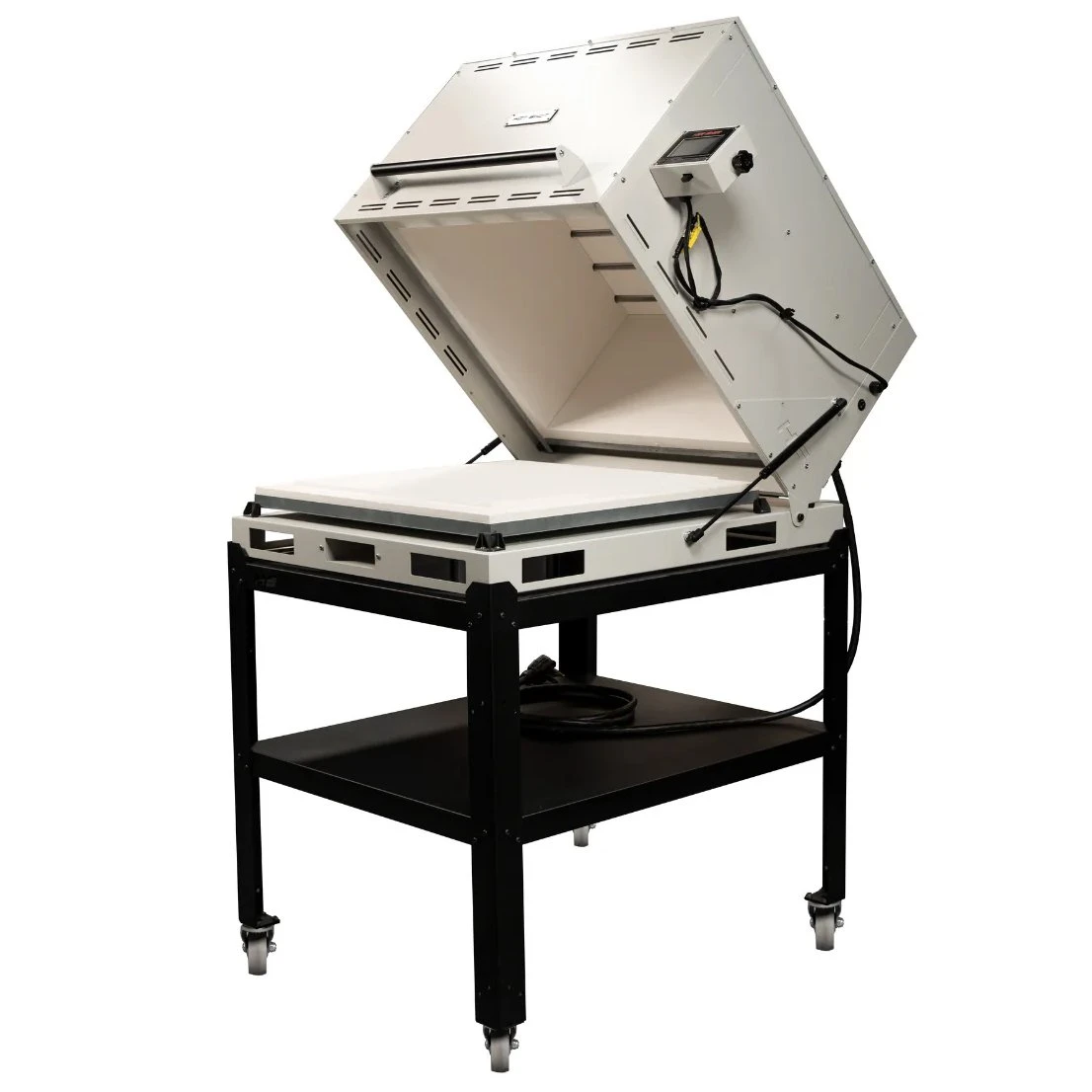 The Hot Shot clamshell kiln is the perfect kiln for any glass artist. Kiln features clam shell design providing easy access to load the 24″ square by 14″ deep firing chamber. Ideal for easy front access allowing you to move your project in and out of the kiln at ease as well as raking or other manipulation techniques. Comes equipped with a cordierite kiln shelf. Plus, huge bonus the floor is 100% removable so you could work on your projects at your workstation too!