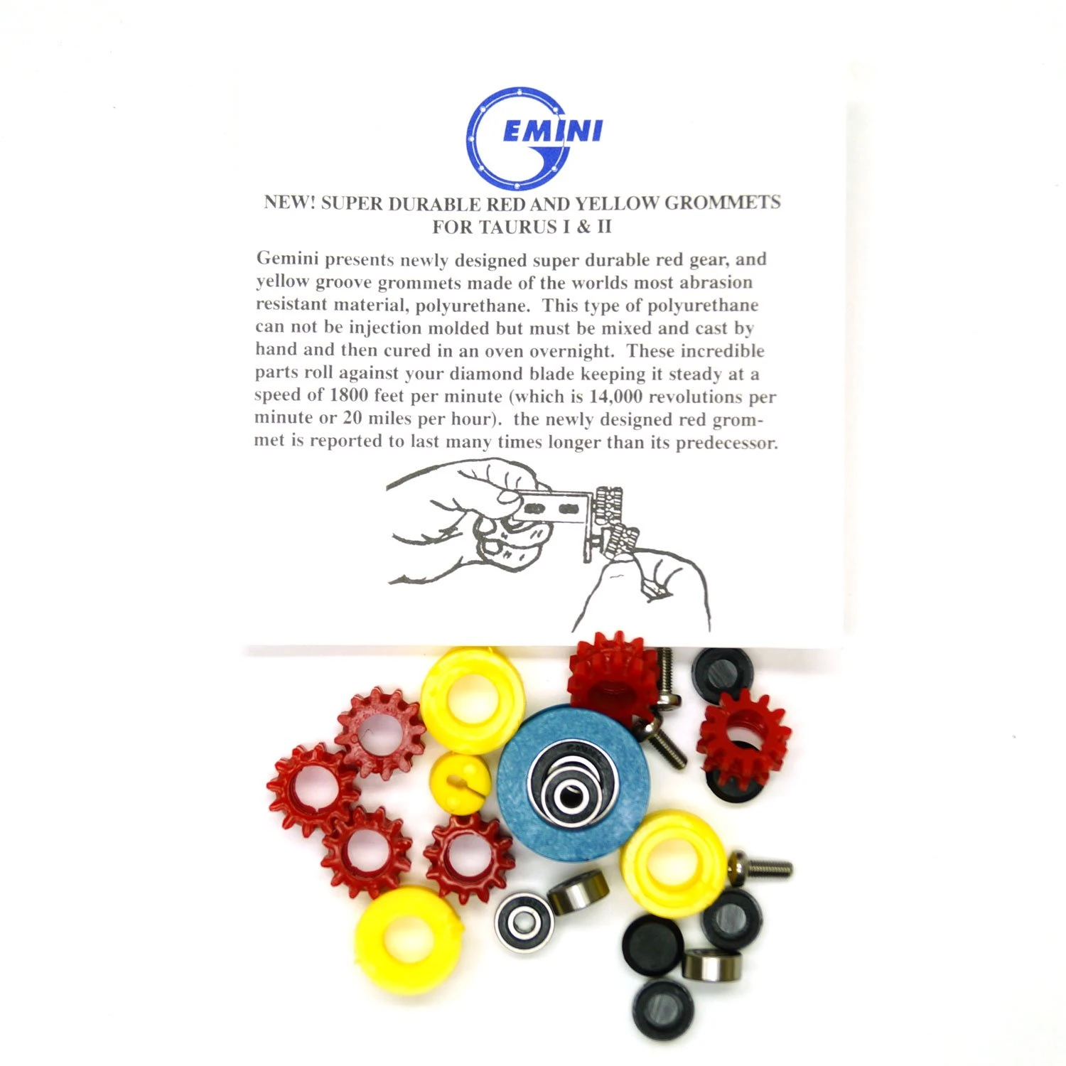 Kit includes: standard blade, drive belt, blue pulley, 5 R2 bearings, 6 red gear grommets, 3 yellow groove grommets, 2 hole reducing plugs, 3 M3 screws.
