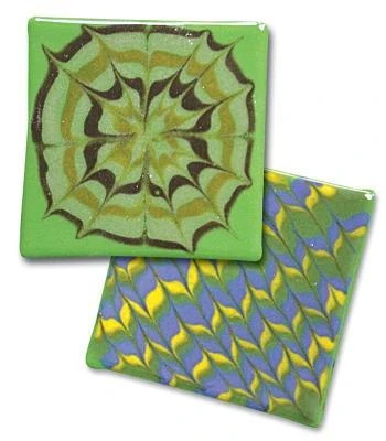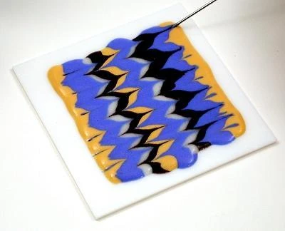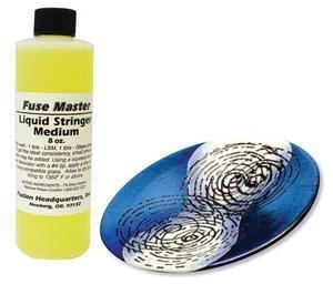 Try combing Liquid Stringer! (see additional images) Draw a pattern with Liquid Stringer mixed with frit. Comb the pattern with a rake and fire beautiful designs. Images courtesy of Fusion Glass.