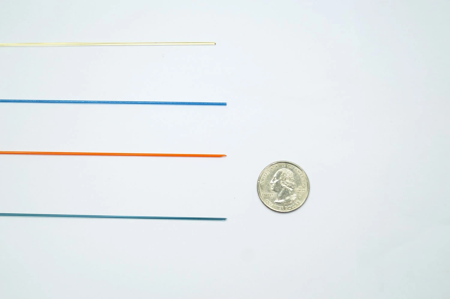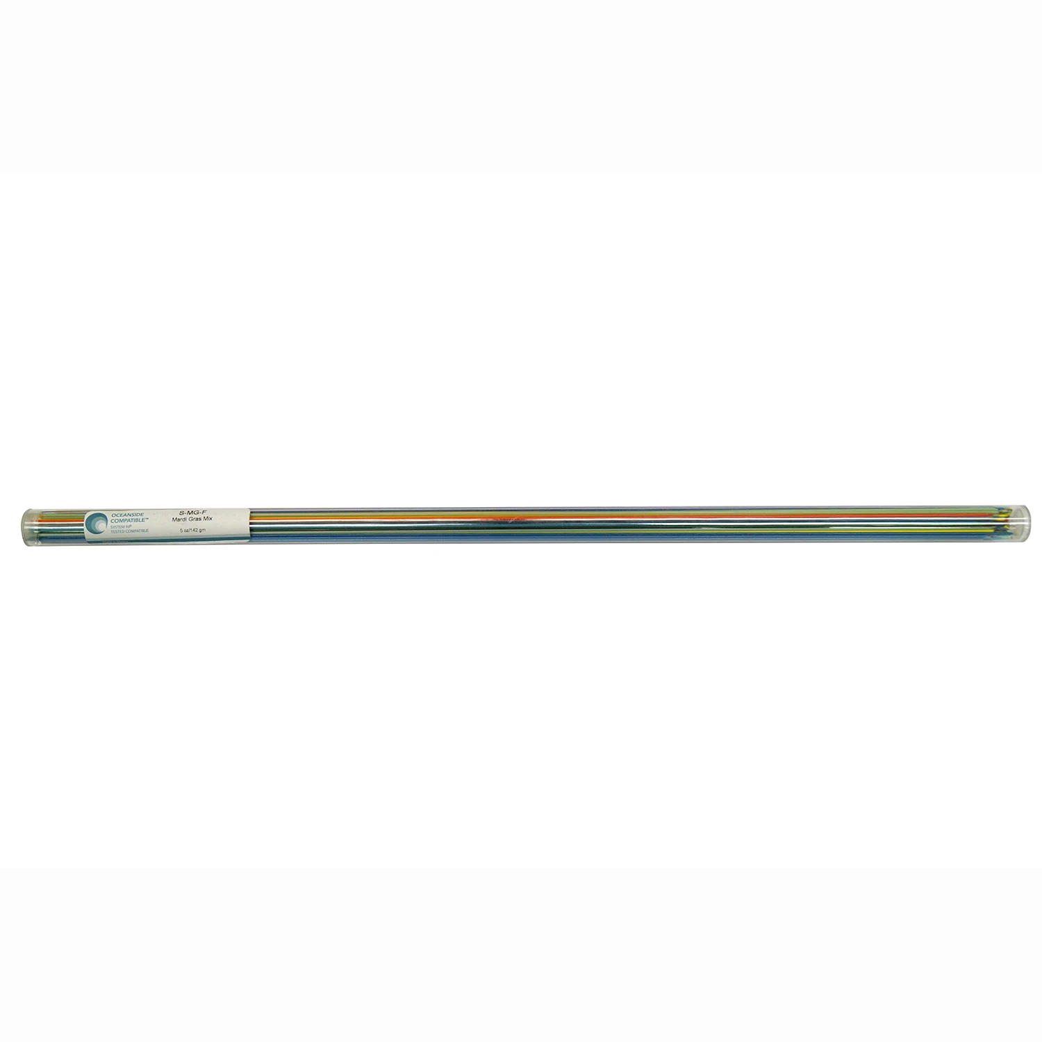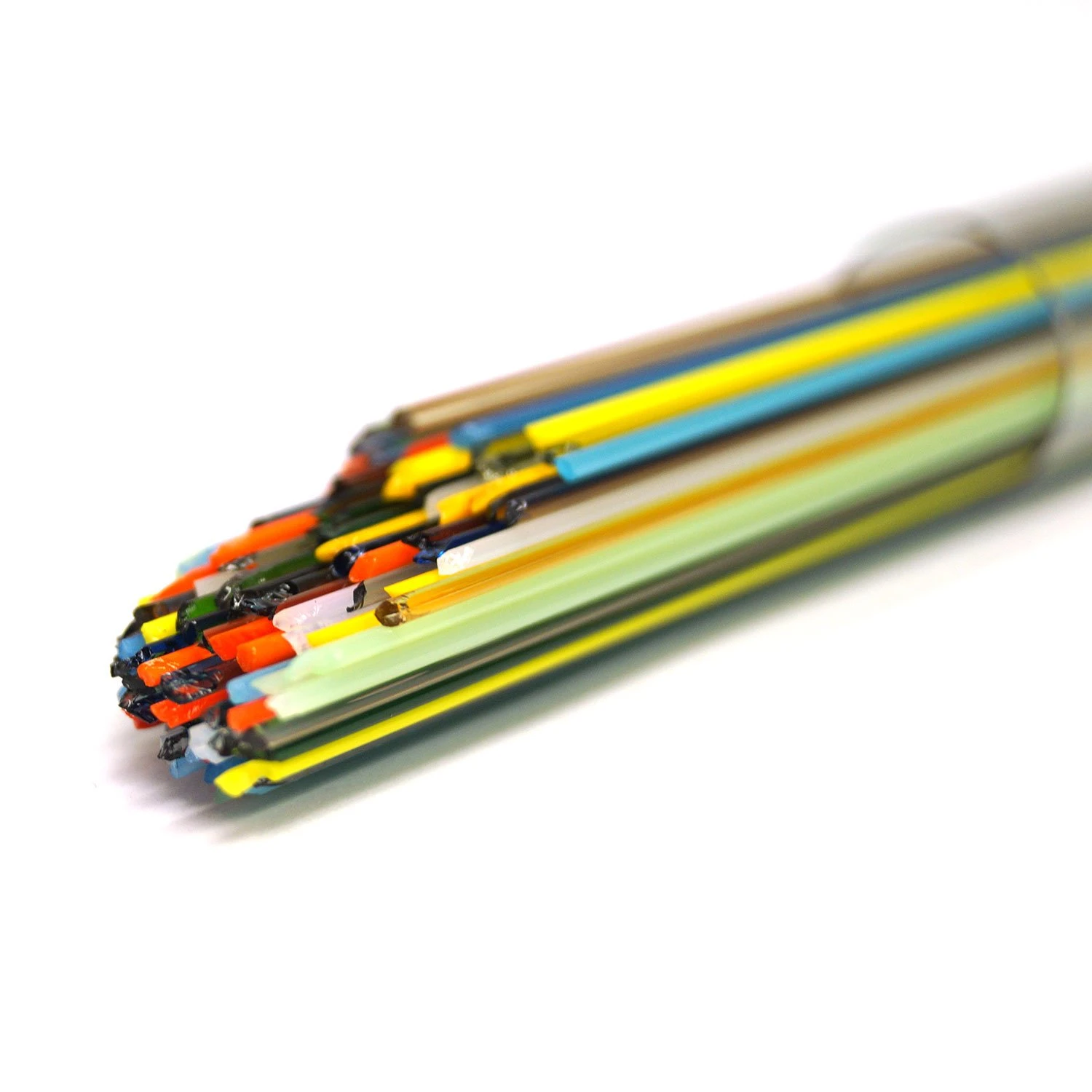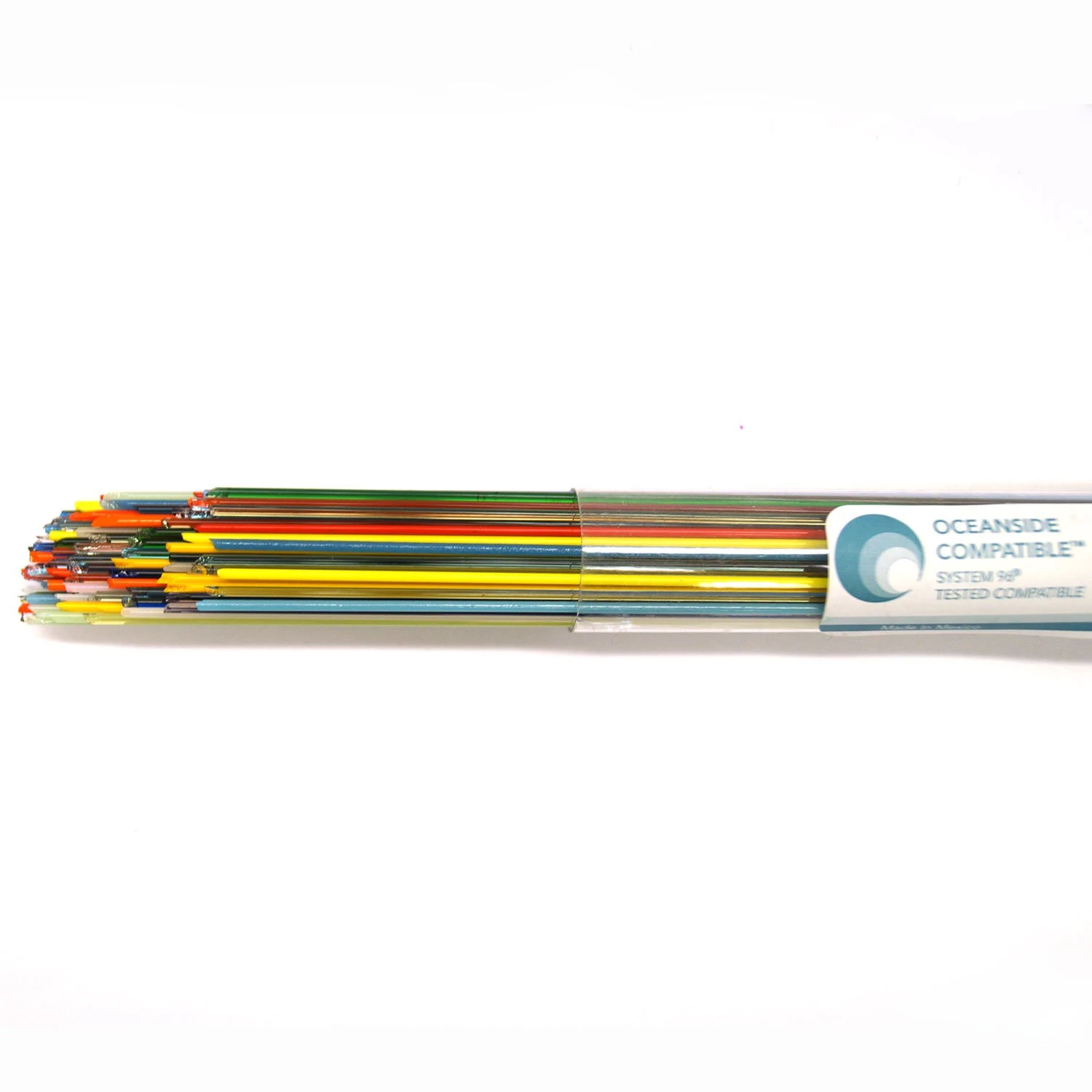 Oceanside Compatible stringer is round in cross-section and measures about 1.5 mm thick and 16″ long. Stringer is thin enough to bend in a candle flame and can be used in many ways, from bead work to fusing to creating murrini.