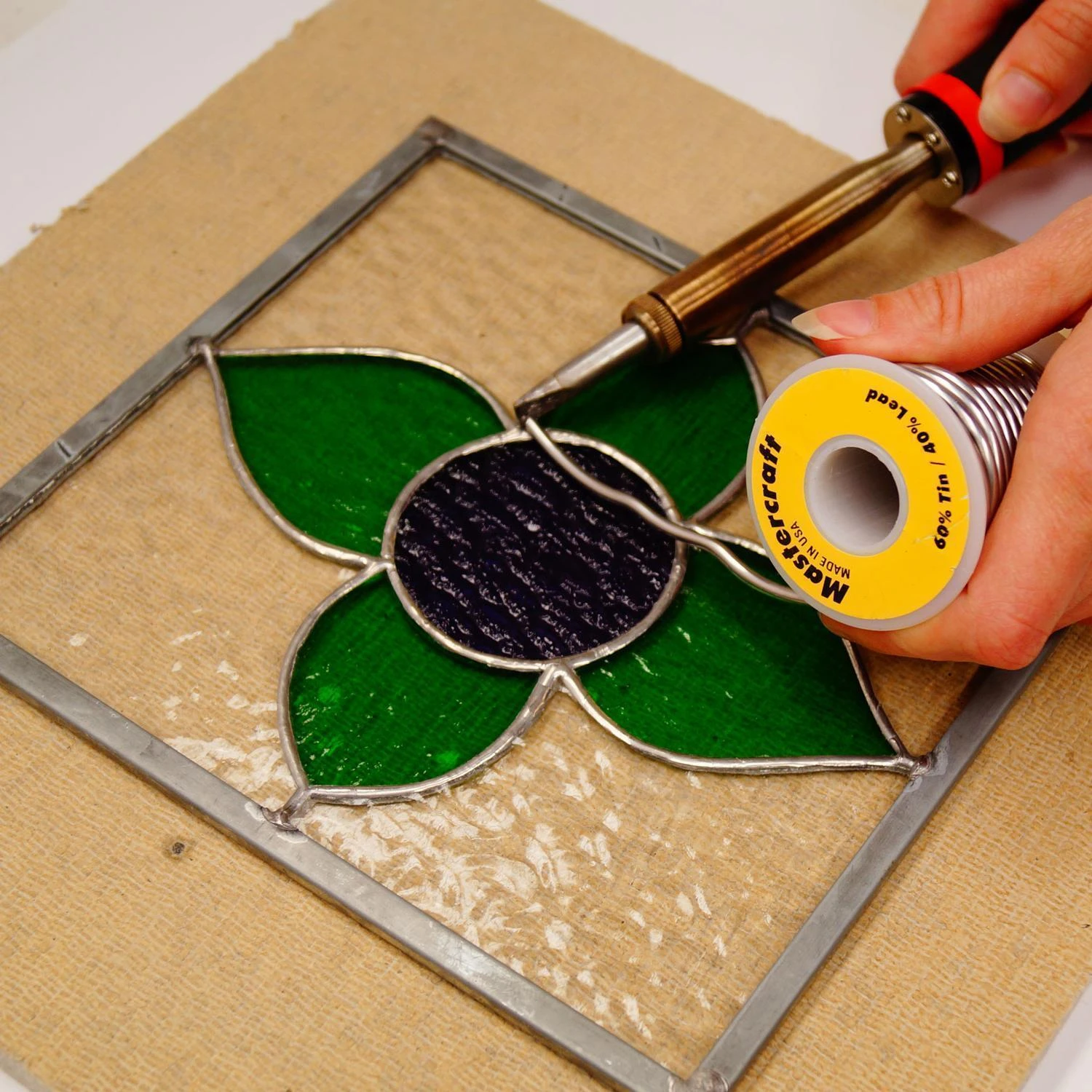 60% TIN / 40% LEAD STAINED GLASS SOLDER: For use on copper foil seams and lead came seams. Offers superior flow over 50/50 with more flow per inch than 50/50. Melting temperature: 361° – 376°F.