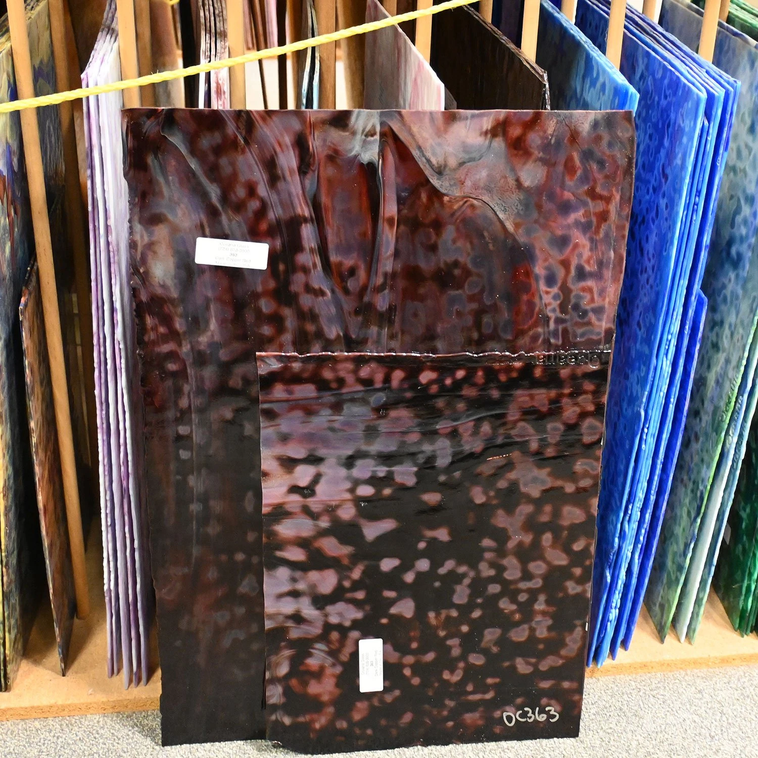 Create with beautifully mottled Oceana glass. Each sheet contains varying degrees of density, creating a three-dimensional quality which is uniquely Oceana. The colors are crisp and vibrant, making it a favorite of glass artists. Perfect for Tiffany lamps and reproductions.