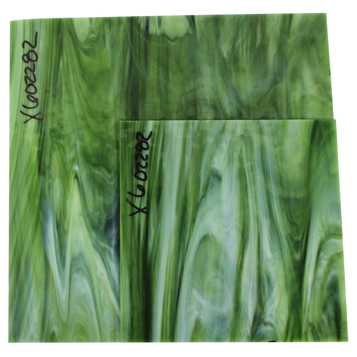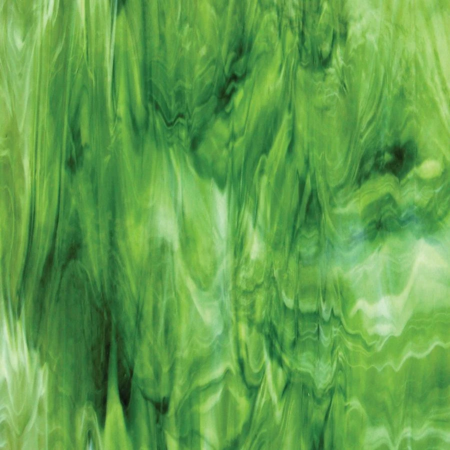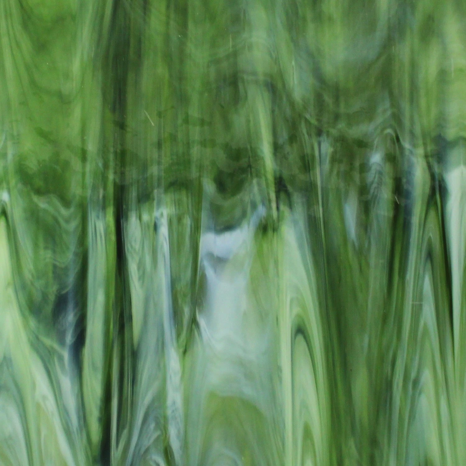 Create gorgeous stained glass projects with Oceanside’s unique Pearl Opals. These stunning color mixes are perfect for those special projects that require dynamic color combinations. Congo Pearl Opal fills the true green slot within the Pearl Opal line. Combining olive green, moss green and clear over the soft pearl opal base, this glass is perfect for trees and folliage. Pearl opals have a soft, semi-granite Corsica texture on one side. This favorite is now fusible. 96 COE.Â