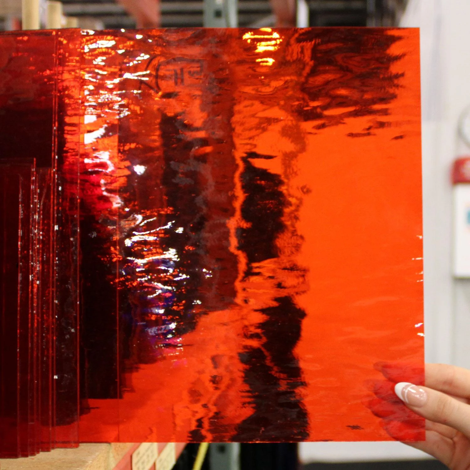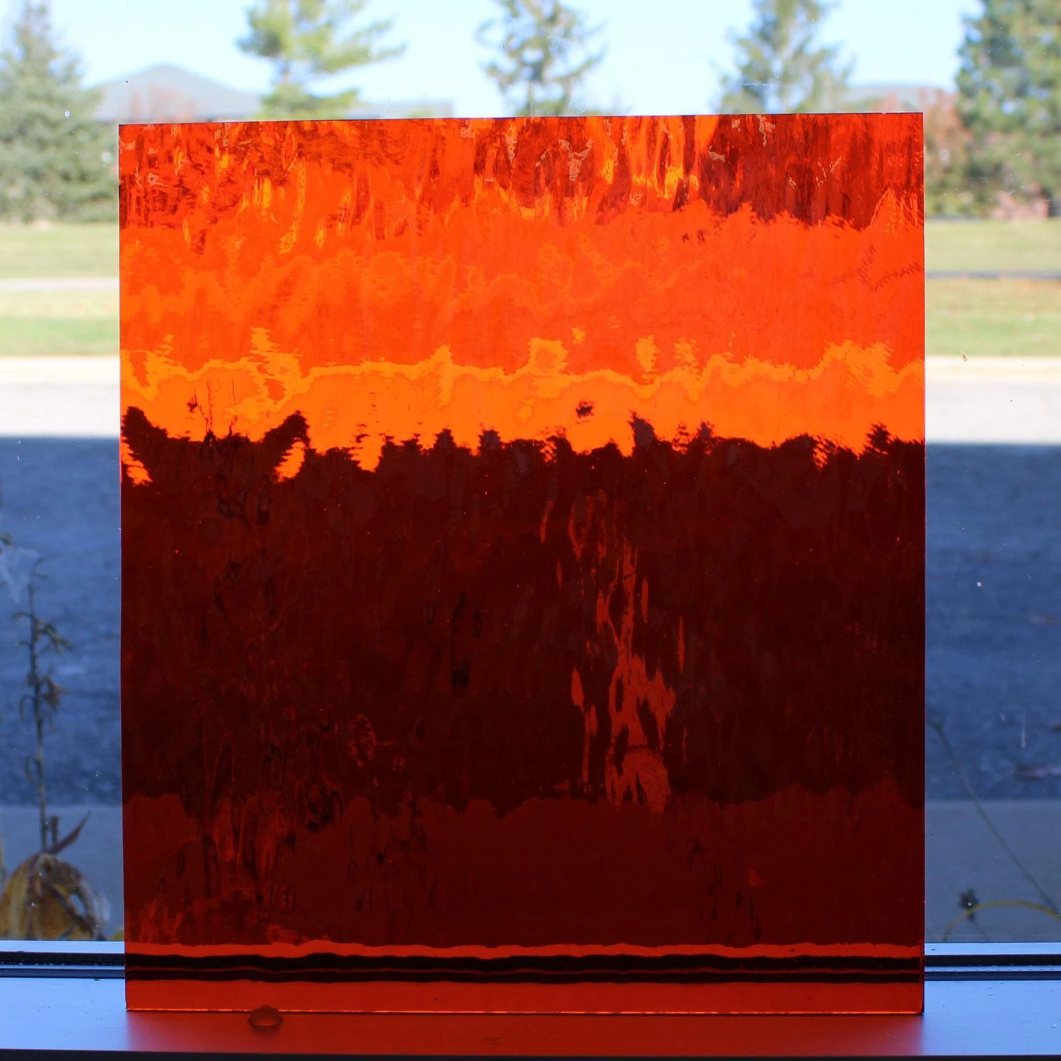 Oceanside Waterglass is a natural surface texture created by stretching the hot glass sheet while it is still in a pliable state. The result is gentle, rolling waves that resemble the surface of a lake or stream. Ideal for backgrounds, water and sky scenes. This favorite texture is now fusible. 96 COE.