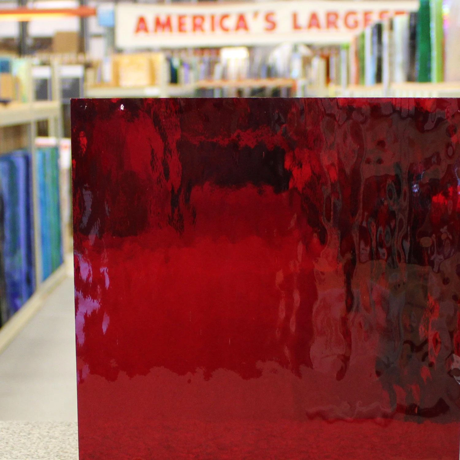 Oceanside Waterglass is a natural surface texture created by stretching the hot glass sheet while it is still in a pliable state. The result is gentle, rolling waves that resemble the surface of a lake or stream. Ideal for backgrounds, water and sky scenes. This favorite texture is now fusible. 96 COE.