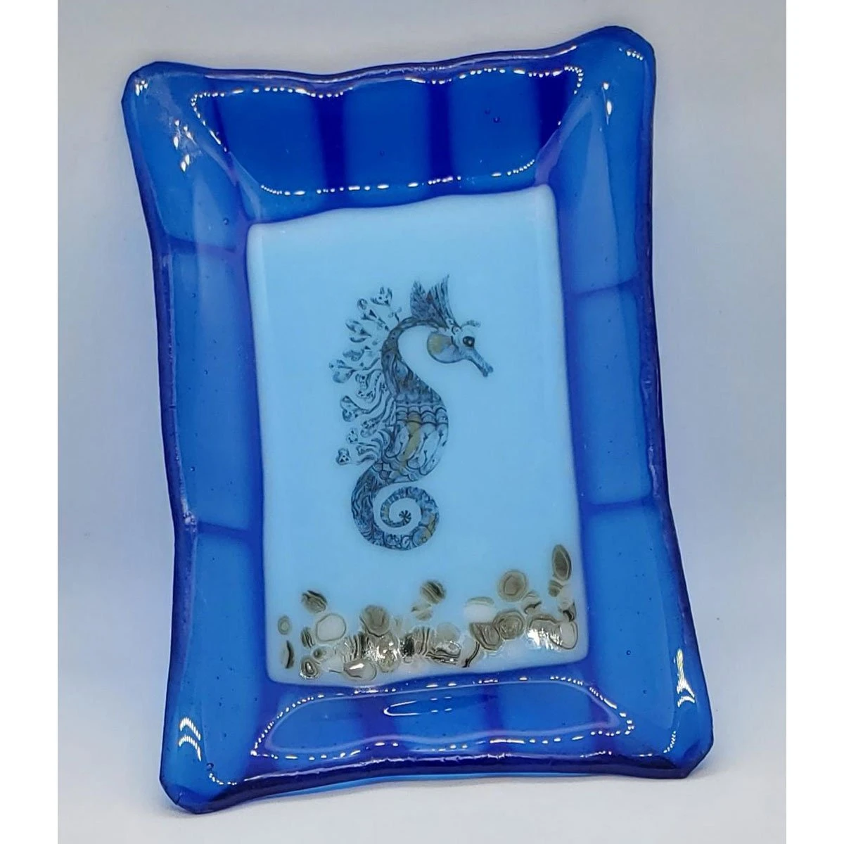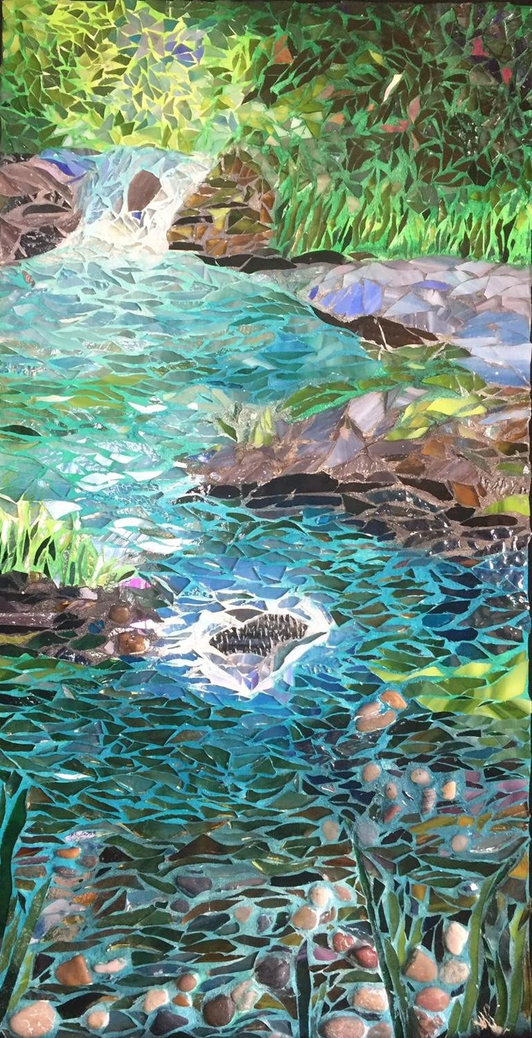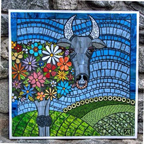 “Waterfall” mosaic by artist Laurel Roush. Bull mosaic by artist Anne Marie Price. “Blue Heron” stained glass panel by artist Andrew Gordon. “Abstract Blues” panel by artist Linda C. Fused “Blue and White Waves Platter” by artist Kristin Collier. “Under the Sea Soap Dish” by artist Kathy Lane. All from Delphi’s Online Artist Gallery.
