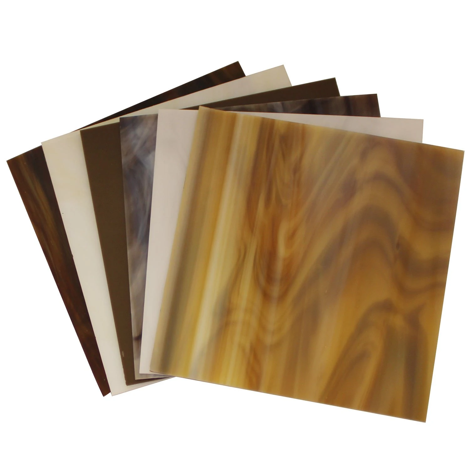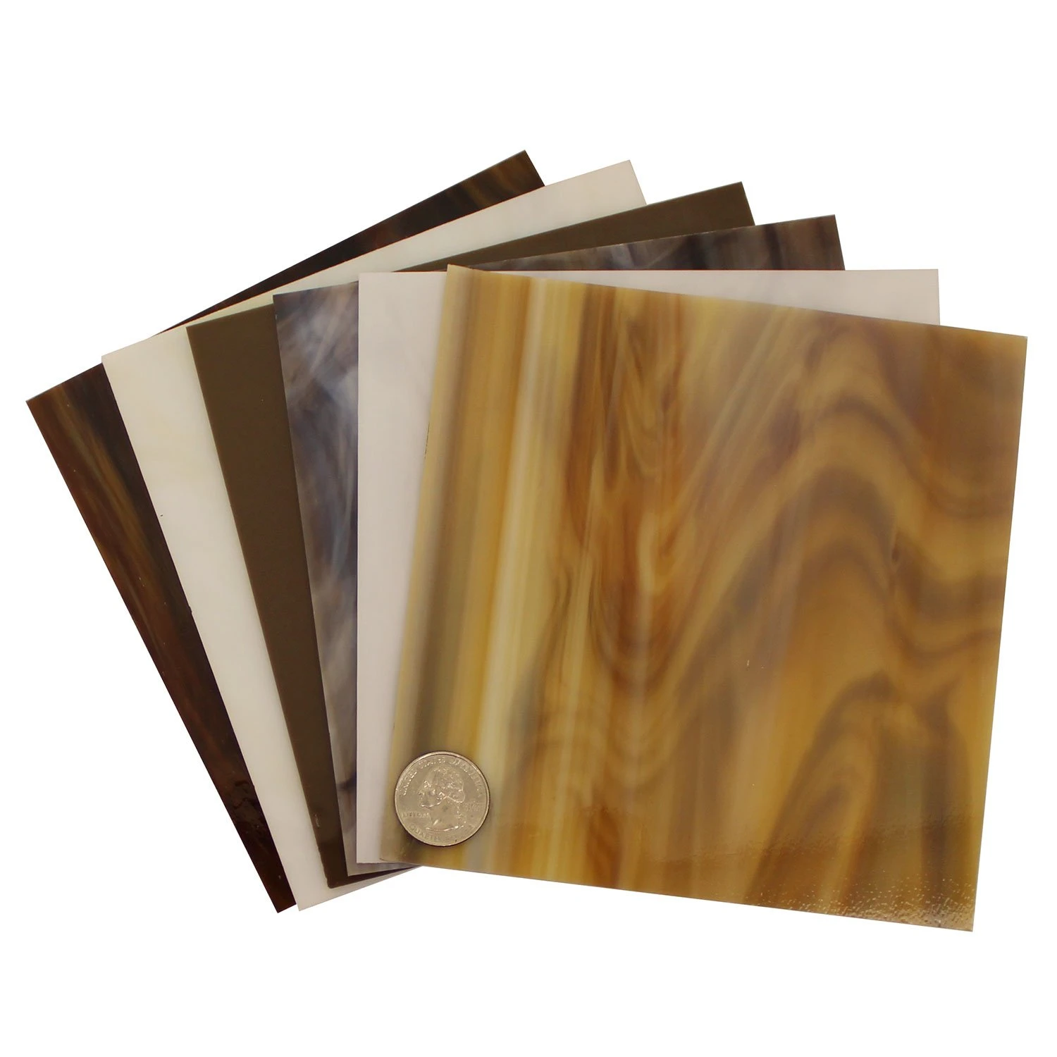 Gradient packs make it easy to add realism to your art and are a quick way to stock your studio with hues of popular colors. Whiskey Barrel includes shades from light ivory to a deep brown with rich ambers in-between. Contains 6 pieces, 6″ x 6″ each. Good for stained glass, mosaics and fusing. 96 COE.