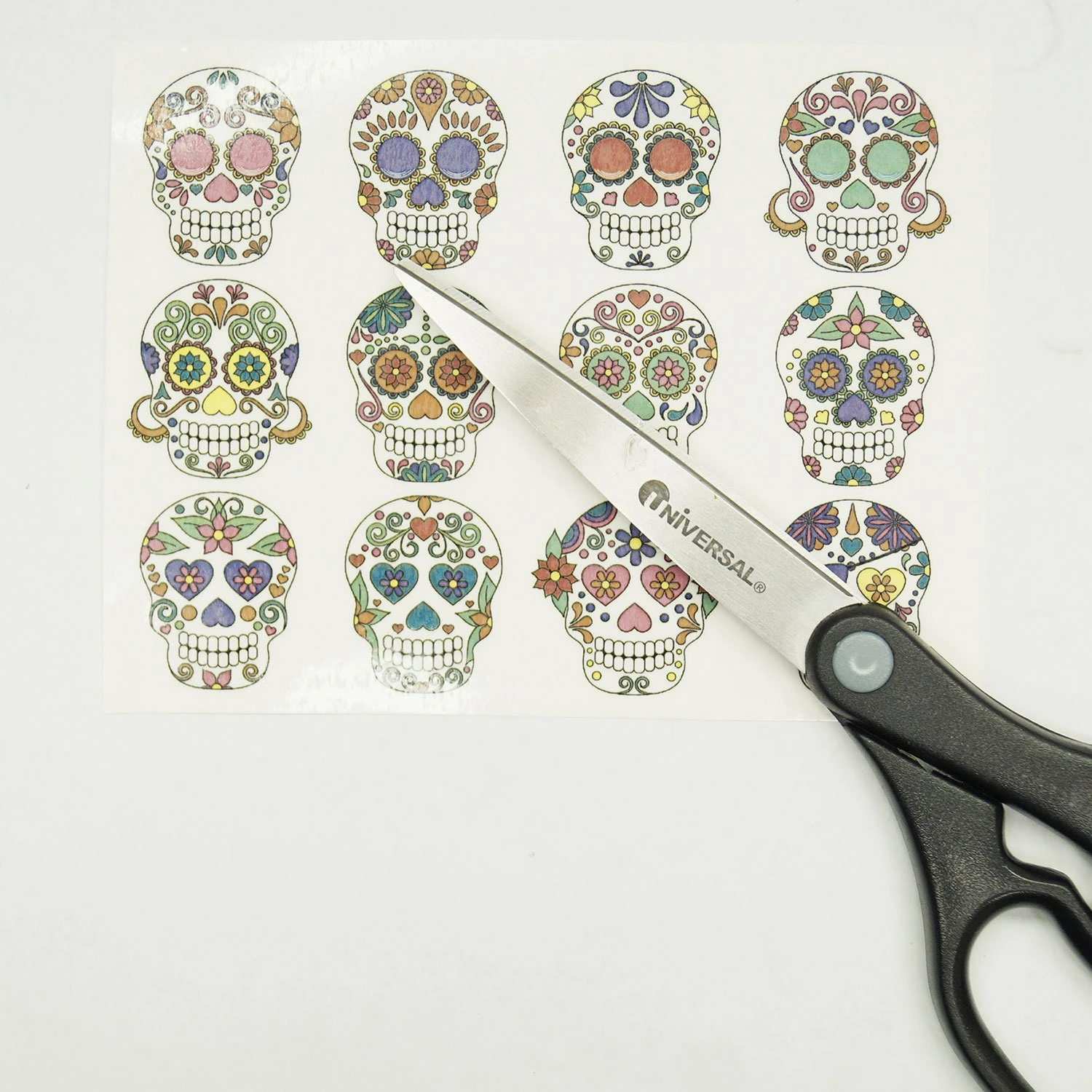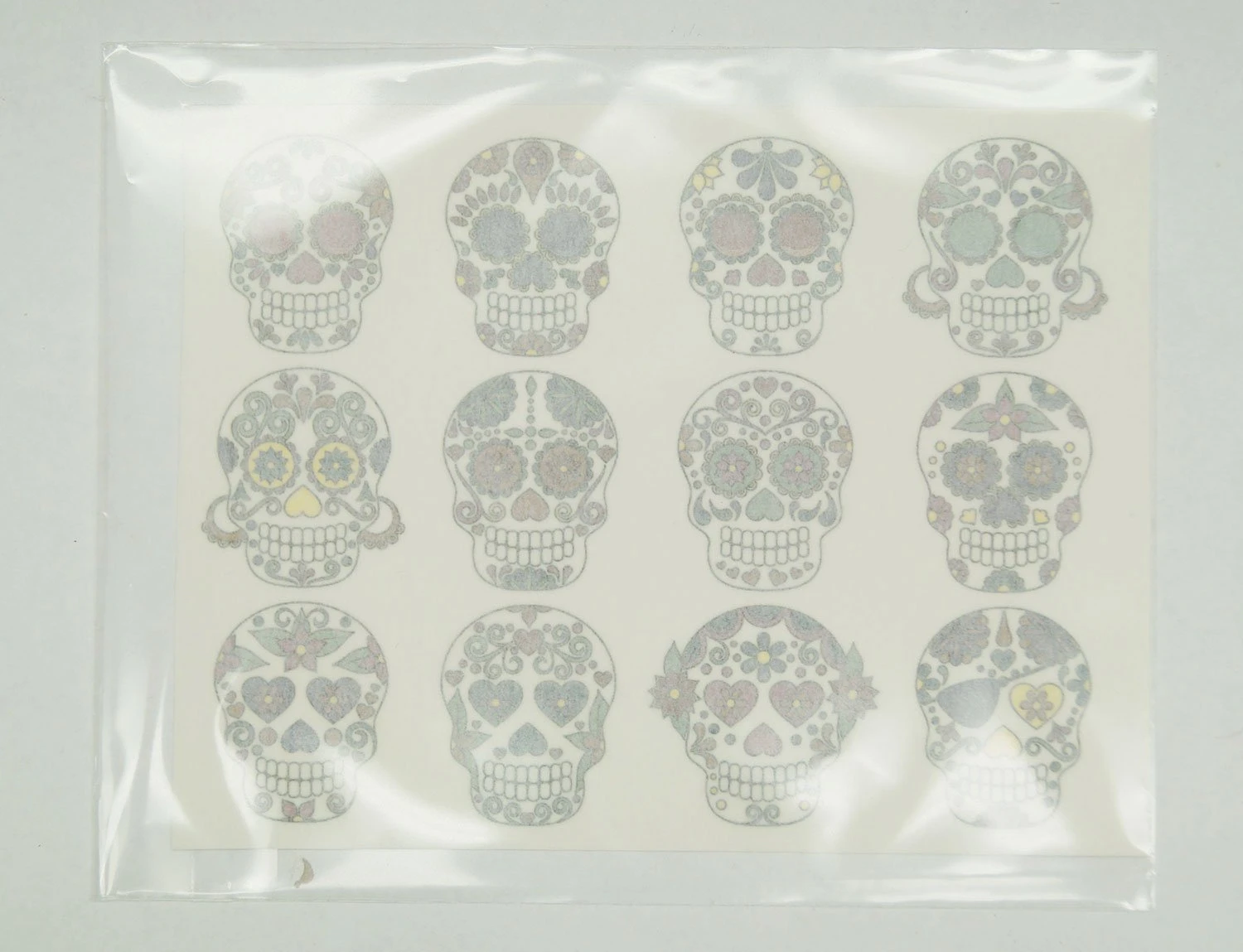 For the price of paper stickers, you can add permanent, colorful detail to your fused designs. Use expressive high-fire decals to make incredible glass art. It’s easy! Simply remove decal from backing, apply to the glass and fire to permanently fuse designs onto glass surface. Fuse Art Decals cannot be torn, scuffed, wrinkled or soaked off the glass surface once fired. Lead-free. Decal sheet measures 3-3/4″ x 5-1/4″ and features 12 skulls measuring 1″ x 1-1/4″ each.