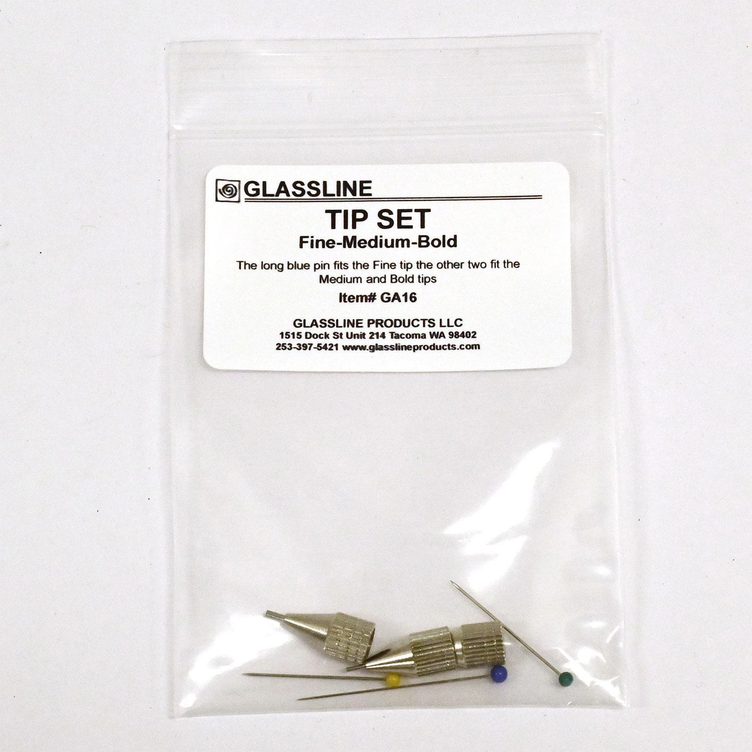 Tip set includes 3 tips: fine, medium and bold. The three different sizes allows you, the artist, the maximum amount of creativity and freedom when designing with the pens. This tip set is to be used in conjunction with the Glassline pens.