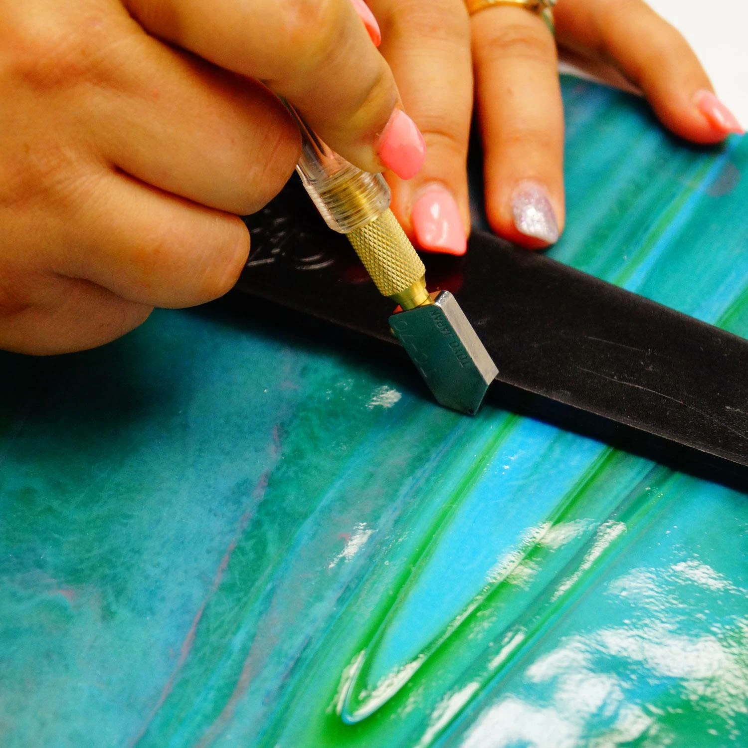 To hold the glass cutter, place your thumb on the backside of the cutting wheel. Place your middle and index fingers on the front, similar to holding a pen. Your thumb and fingers should be positioned just above the cutting wheel. For more control place your free hand in the same position.