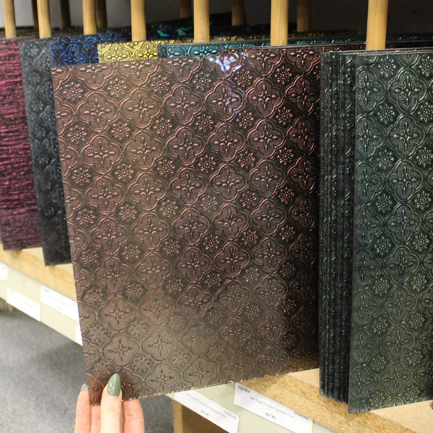 Create with this stunningly different glass! Van Gogh features a smooth front surface and a gently textured reverse side that is coated with gorgeous color and sparkle. The durable coating will not chip when cutting and provides excellent opacity for making mosaics, stained glass boxes and more. All Van Gogh glass is handmade, which means actual glass may vary slightly from photo. Sold in 12″ x 12″ pieces.