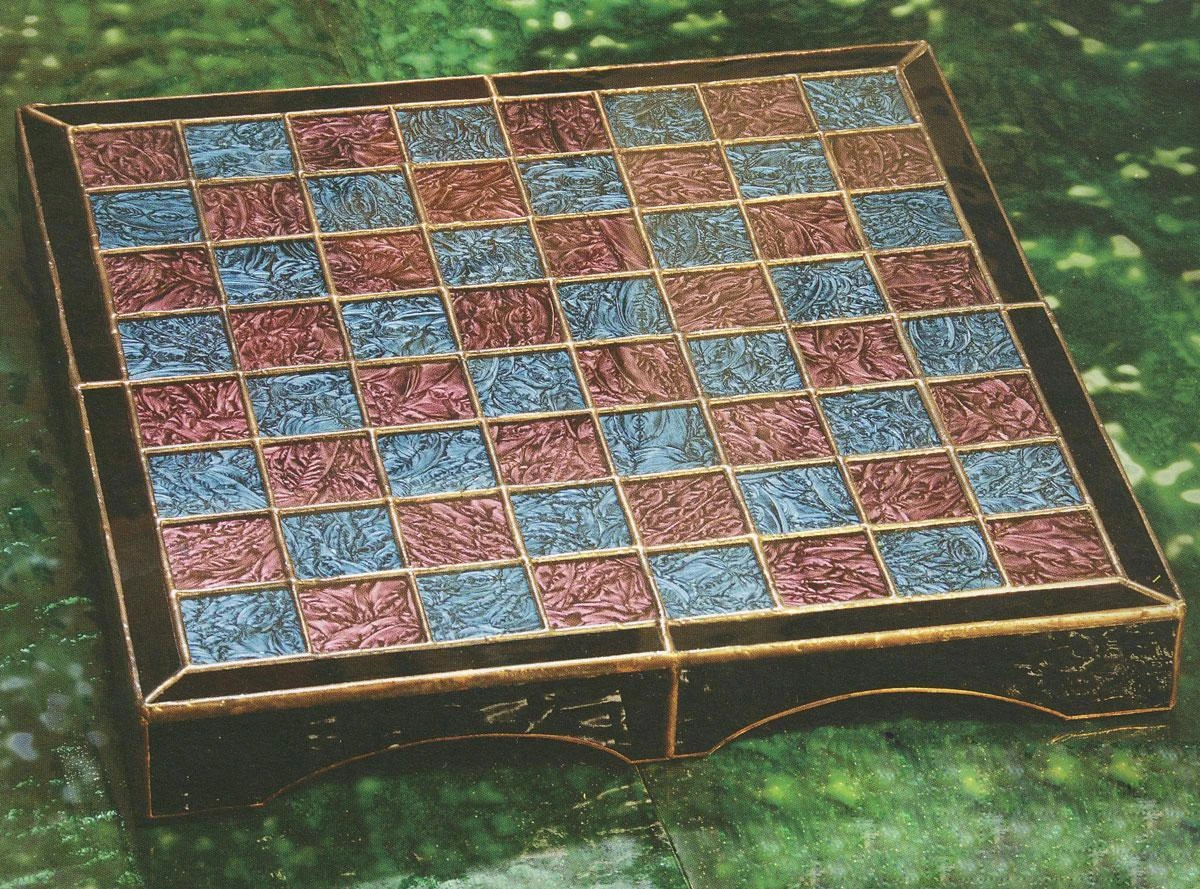 Mosaic vase and vanity projects created by artist and Delphi guest instructor Tom Snyder. Mosaic rose table by artist Keturah Esch. Stained glass checkerboard created by artist Michael Johnson. From “40 Great Stained Glass Projects” book #6324.