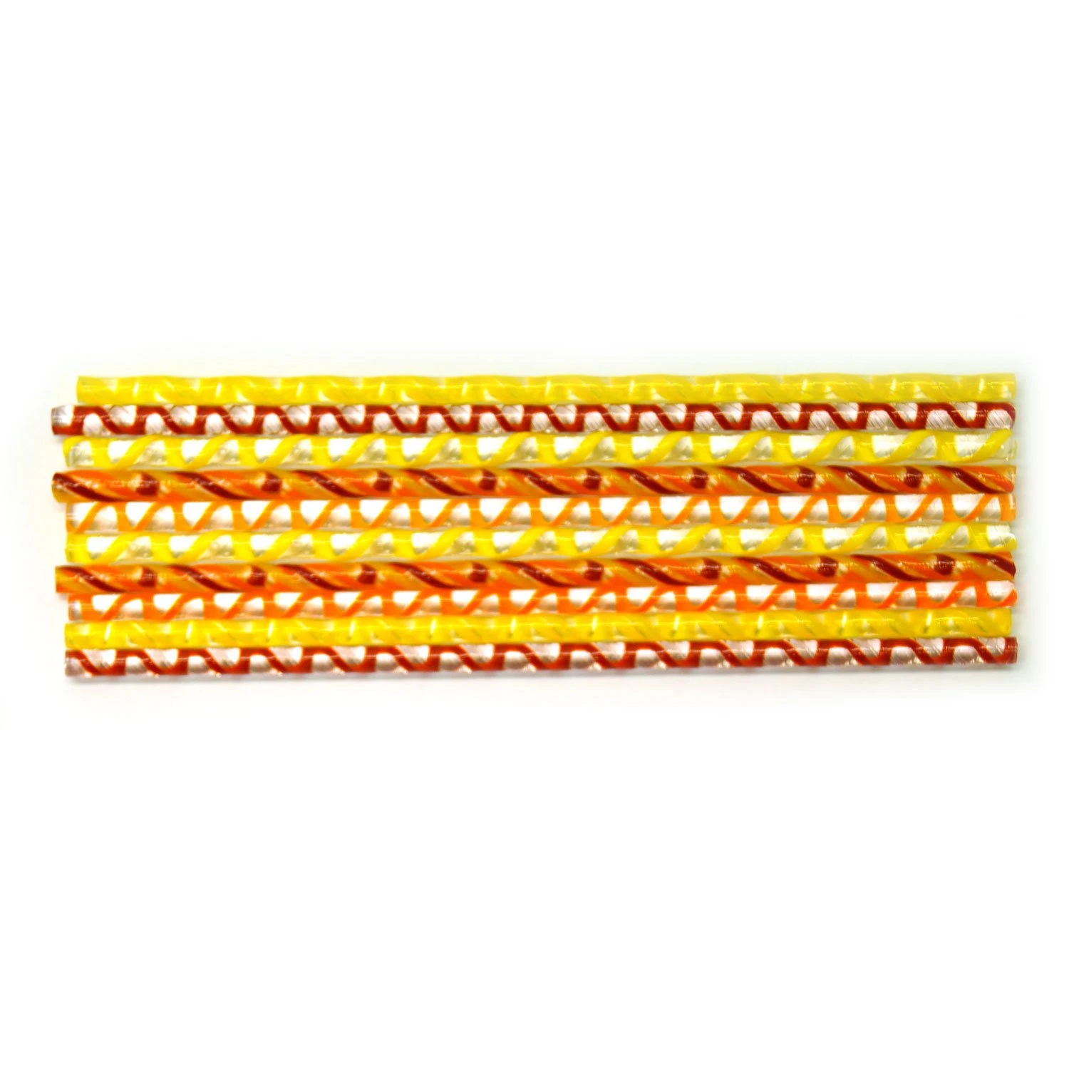 Fun warm colored striped rods are made from premium glass. Use to create fun borders and accents in fused projects. Cane are approximately 4mm to 7mm diameter x 5″ long. 10 pieces. 96 COEÂ