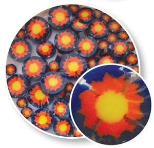 Blue and orange glass encapsulates bright opal and transparent glass that centers in a exquisite sun pattern. Made from premium Bullseye fusible glass, use in fusing, flameworking and micro mosaic projects.1/2 oz. pack. 90 COE.